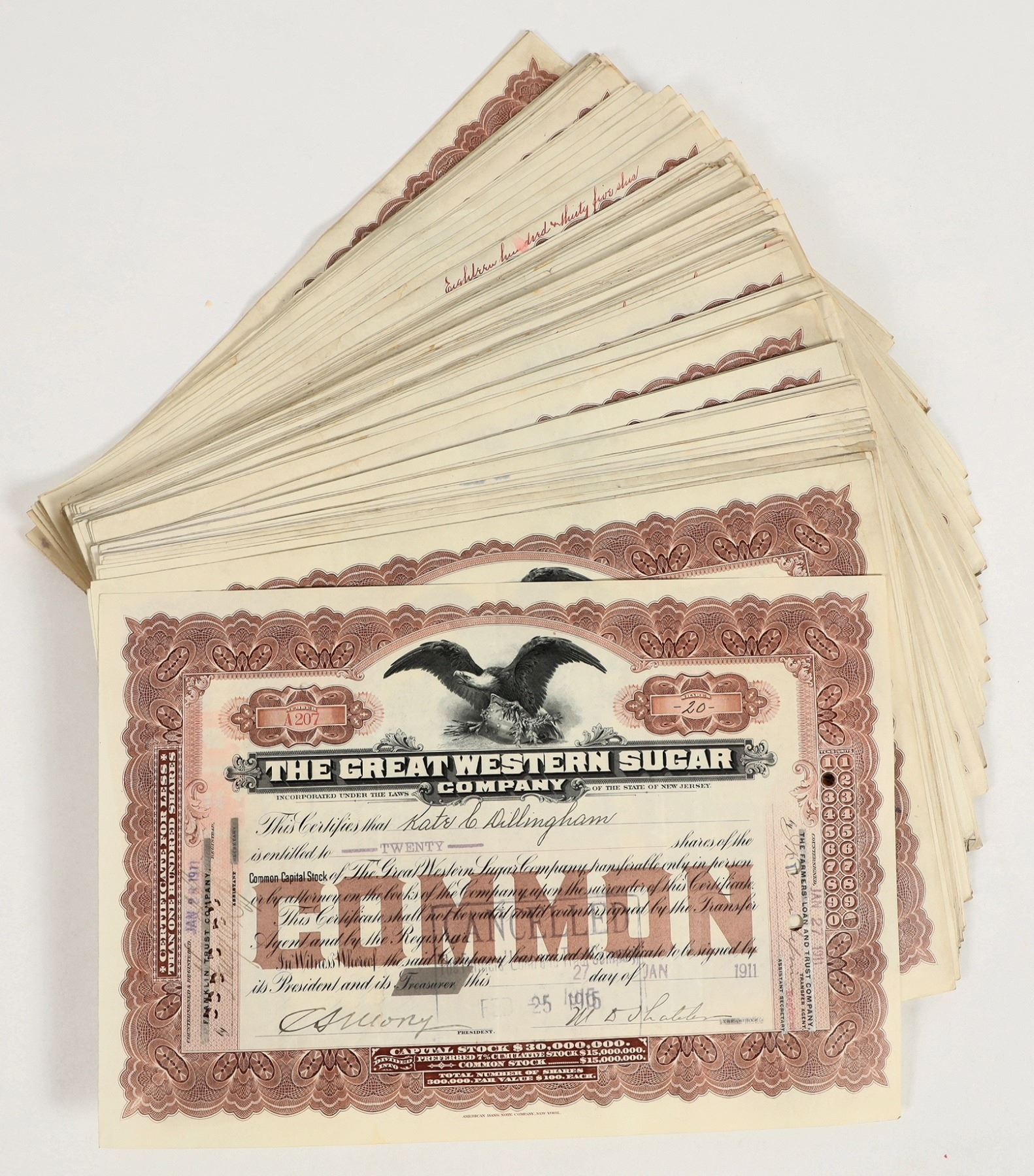 Great Western Sugar Company Stocks c1910-11 About 150 issued, cancelled with endorsements and revenue stamps on some reverses. The Great Western Sugar Company was a pioneering sugar beet producer co-founded in 1900 by Charles Boettcher