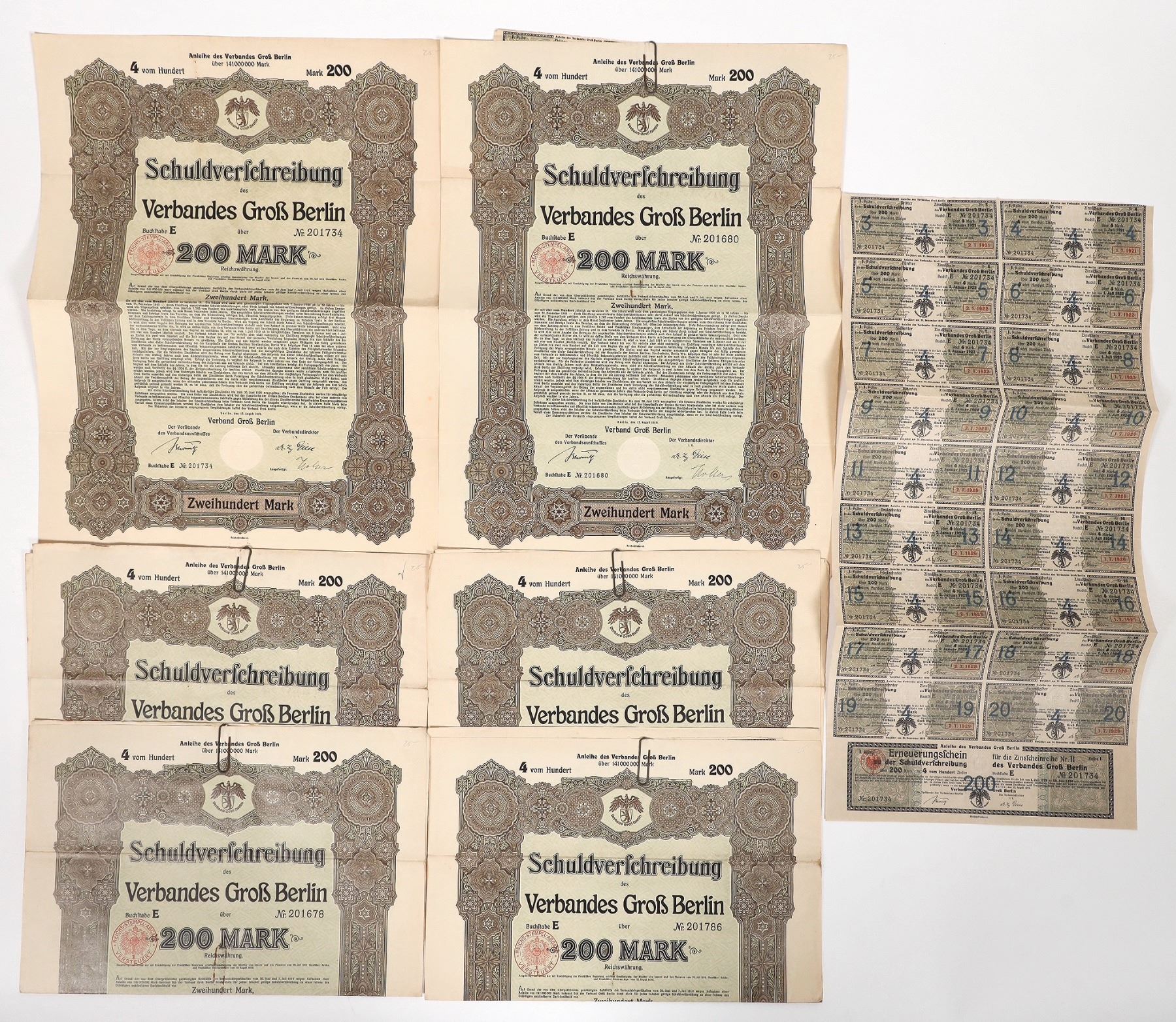 Group of 6 bond certificates from the Verbandes Gros Berlin (Greater Berlin Association) for bonds worth 200 or more marks. All date from 1919. All bond coupons intact on each. Excellent, intricate border featuring the Berlin coat of arms. Fine condition -- some toning and creasing, stains from rusted paperclips.