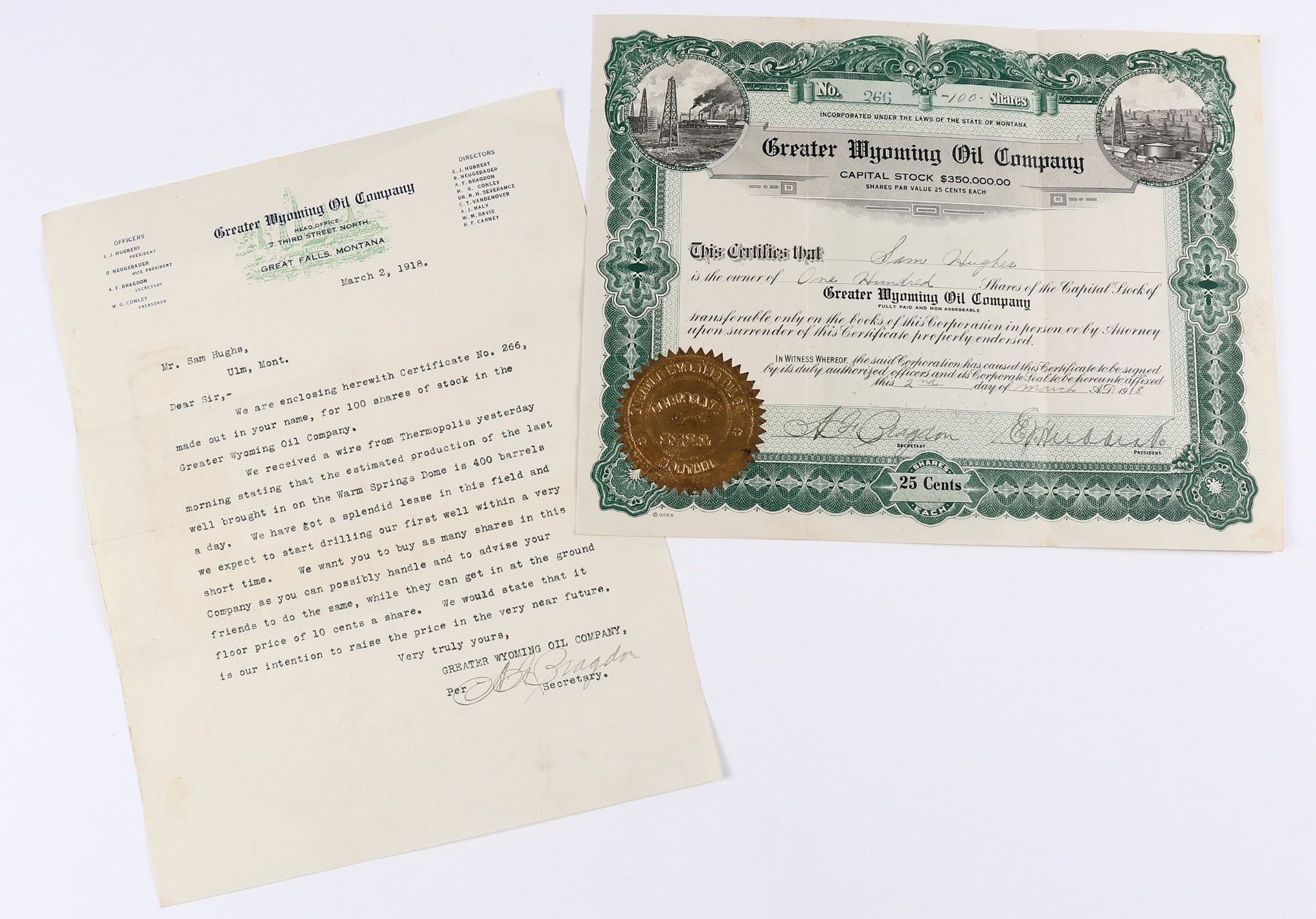 1918 Greater Wyoming Oil pictorial derrick letterhead and stock, both to Sam Hughes. Montana Great Falls 1918