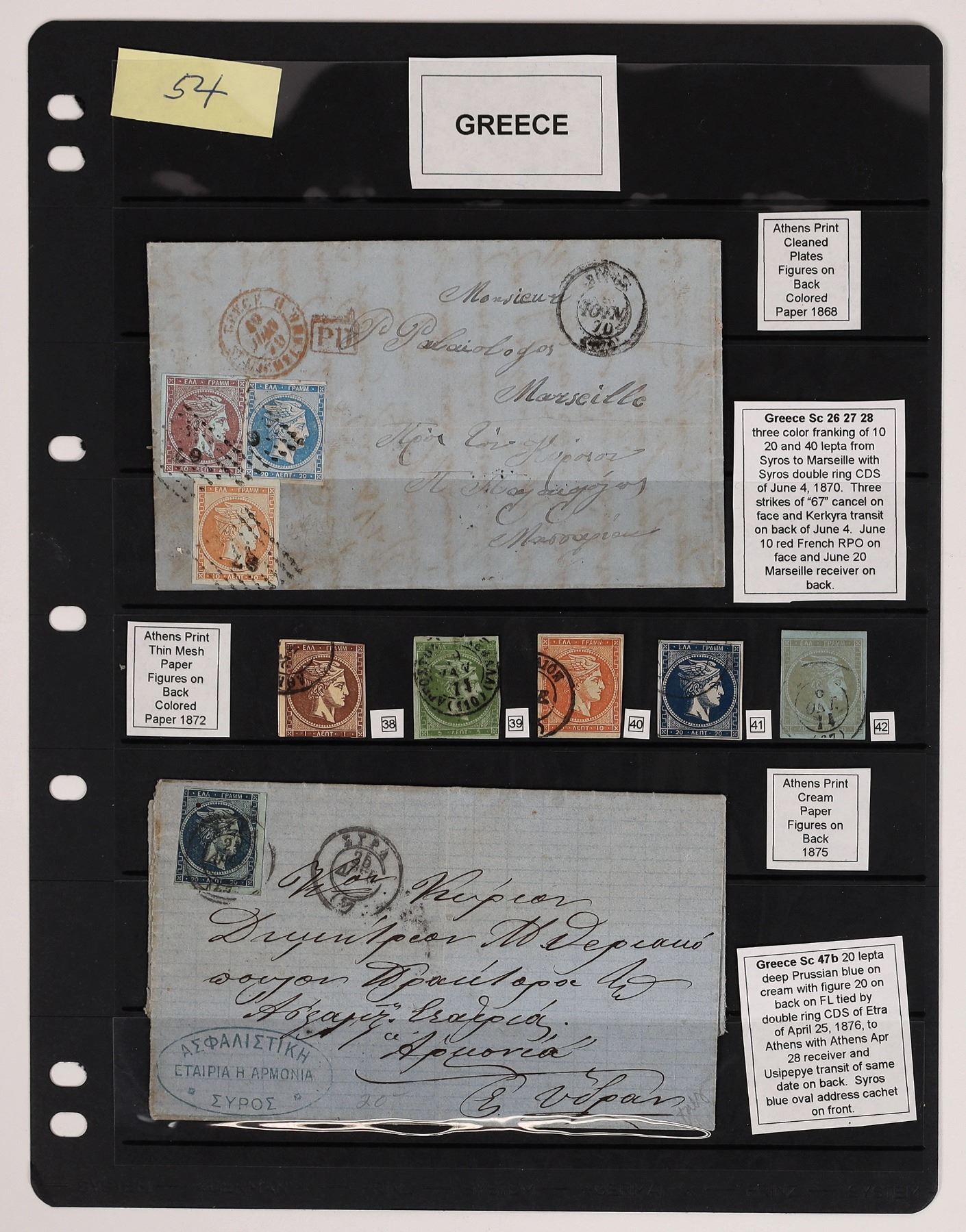 Greece 1870 lettersheet to Marseille franked with 1868 40L, 20L & 10L (Scott #26-8) tied by "67' killers, alongside Syra date stamp and red French RPO date stamp, pretty three-color franking, also 1876 lettersheet with 1875 20L, and a selection of Hermes Heads (x39, owner's 2005 Scott $193).