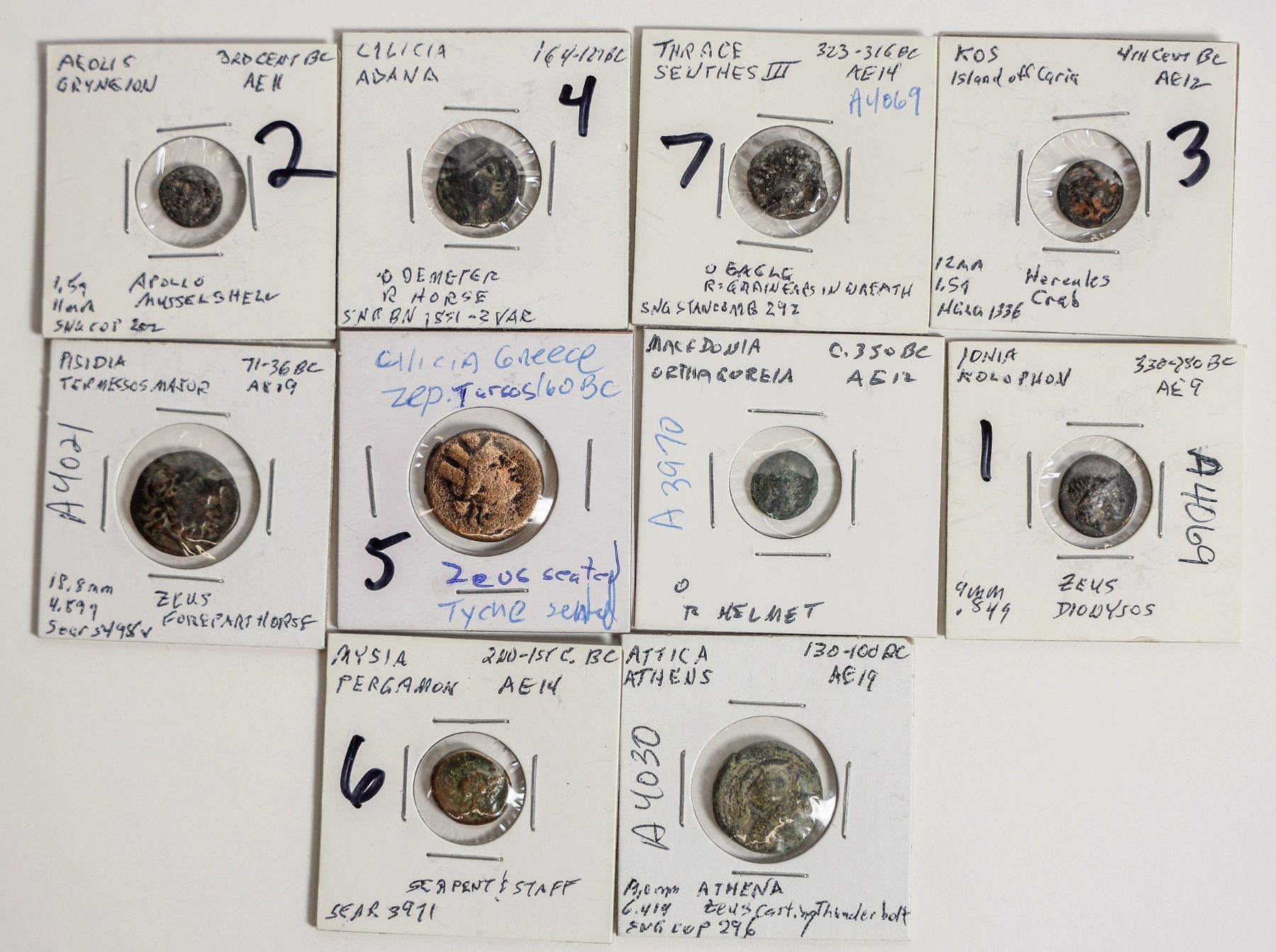 A nice variety from Athens, Macedonia, Pisidia, Aeolis, Adana. Gods and goddesses, horses, crab, helmet, mussel, eagle, grain. AE 11-19, about fine to very fine.