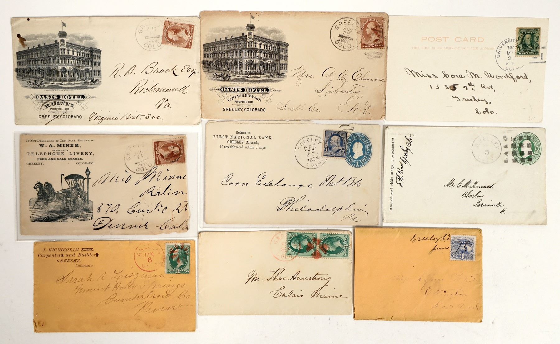Lot of 9. No contents. 1) Greeley, C.T. manuscript cancel on cover to New York. 3 cent railroad stamp. 2) Two covers with red Greeley cancels incl. one corner ad cover for J. Higginbotham. 3) Two pictorial ad covers for the Oasis Hotel, 1884 and 1886. 4) Pictorial cover for WA Miner, Telephone Livery, 1885. 5) Others: First National Bank cc, 1894; 1907 post card; and cover with interesting grid cancel. Please inspect.