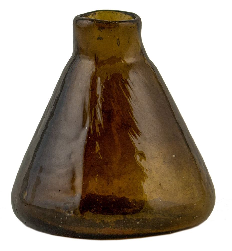 Beautiful green amber cone ink with open pontil. "X" embossed n the bottom. 2.25" diameter at base, 2.25" tall. Bright and vibrant, problem free. City: State: Inventory Number: 39525