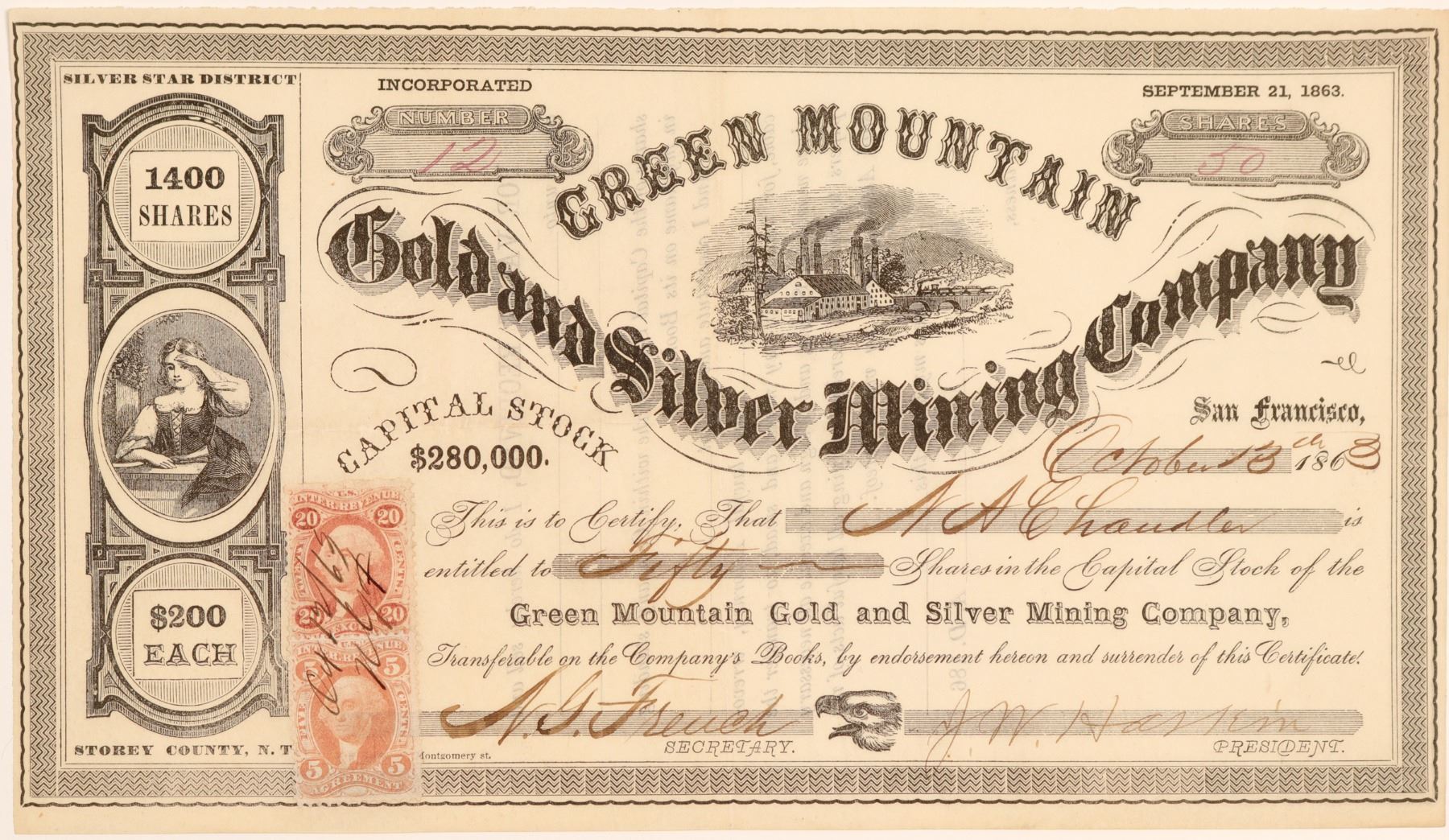 A very rare mining stock with wonderful ties to territorial Nevada history! Silver Star District (printed upper left), Storey County, N.T. (printed lower left). Incorporated Sept. 21, 1863. Low No. 12, issued for 50 shares to N.A. Chandler on October 13th, 1863. in San Francisco. Signed by J.W. Haskin, president, and N.G. French, secretary. Not cancelled. Two vignettes: surface mine workings (top center) and woman (left). Two revenue stamps (20 and 5 cent) attached. Folds, light wear. Printer obscured by stamp. Listed in the 1864 Collins Comstock directory with French as secretary and office at 426 Montgomery St. in San Francisco. The Silver Star District was located east of Virginia City. It was later renamed the Brunswick District after the Brunswick Lode and then renamed again as the Comstock District. _x000D_