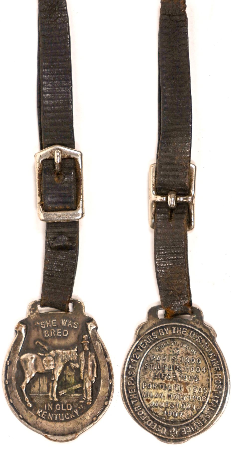 Obverse: "She Was / Bred / In Old / Kentucky" (image of man pointing to horse with sack labelled "Green River"). Reverse: "Used For the Past 12 Years By The U.S. Marine Hospital Service / Highest Awards / Paris 1900 / St. Louis 1904 / Liege 1905 / Portland 1905 / Milan, Italy 1906 / Jamestown / 1907." 1.5" x 1.25" Famous whiskey company started in the 1800s in Owensboro, KY by J.W. McCullough.