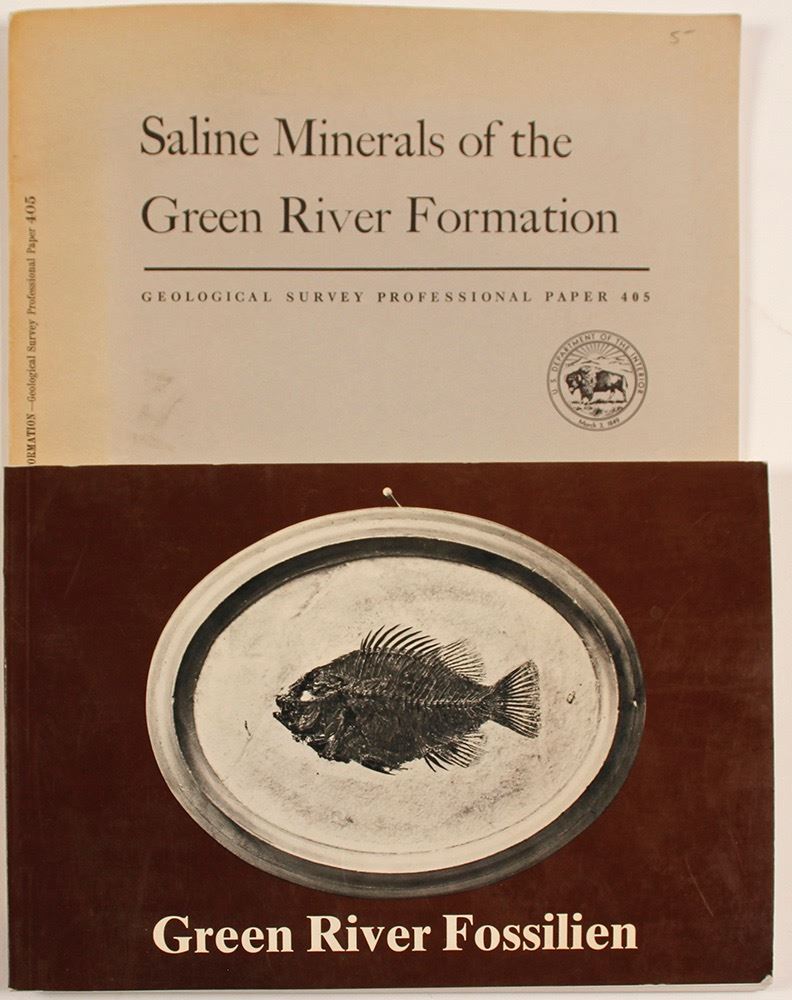 Green River Fossilein by Siber, 81pp softcover, many b/w fish fossil photos, text in German. Saline Minerals of the Green River Formation by USGS 50pp. Date: Location: Wyoming HWAC# 56541