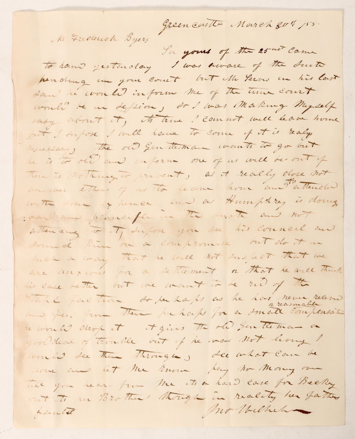 Handwritten 1855 letter from Ino (last name illegible) of Greencastle, PA to Mr. Frederick Byers of Ravenna, Ohio. The letter discusses an ongoing court case, and Ino describes his anxiety to reach a settlement, though the subject of the case is unclear.