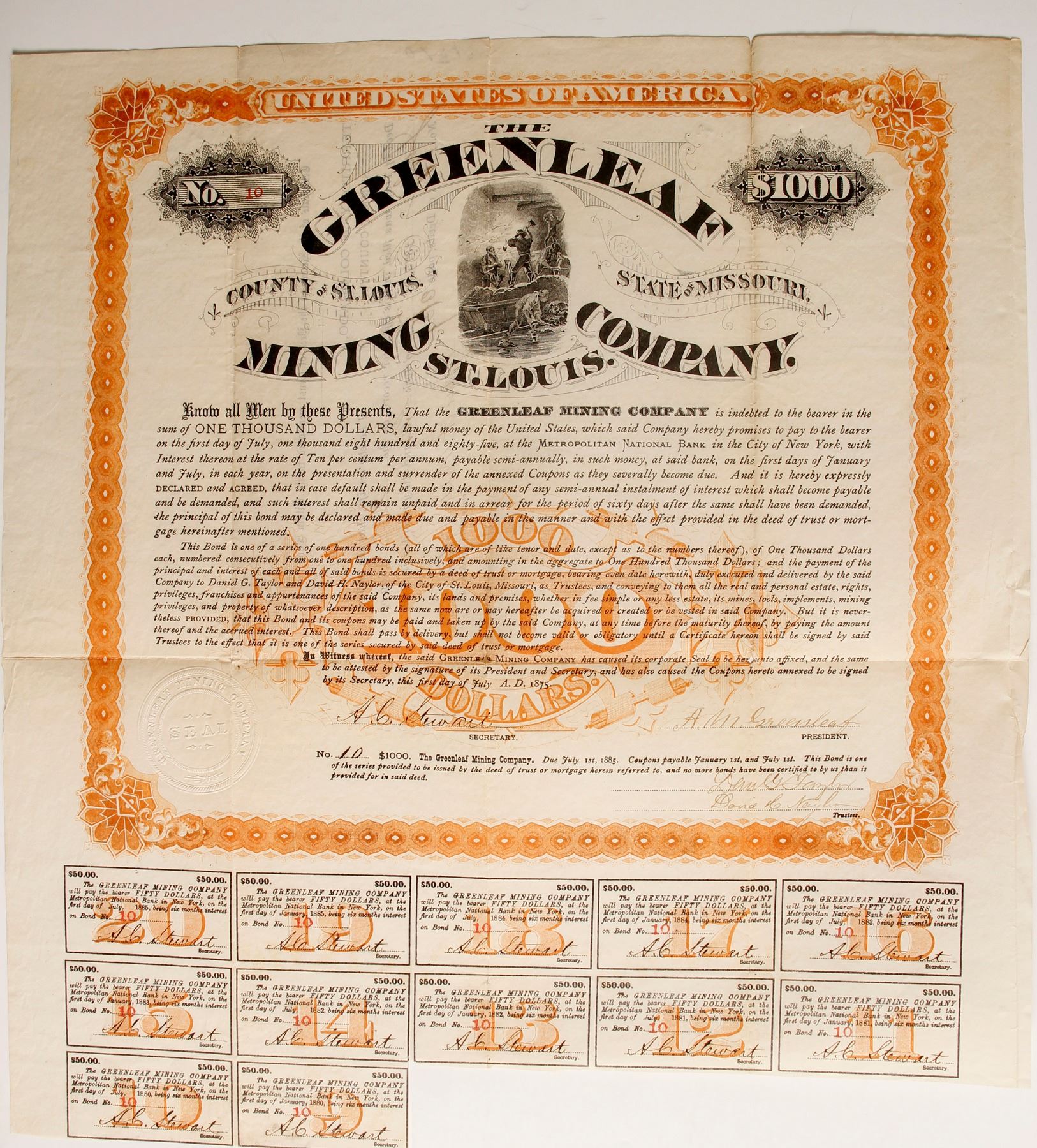# 10 for $1000. 1000 total bonds to be sold. Coupons 9 through 20 attached. Rip at fold intersections. Bright and colorful! Signed by AM Greenleaf as president. Greenleaf made his fame with water: ditches and flumes. For example in 1871 AM Greenleaf purchased all water rights of the Cooley and other gulches with the intent of conveying such water to Saw Mill Gulch in the Gold Hill Mining District. He also incorporated the Springfield Mining, Ditching and Fluming Company; the Greeley Mining, Ditch and Fluming Company and the Fuller and Greenleaf Mining and Ditch Company. Interesting Colorado personality. Ken Prag Collection