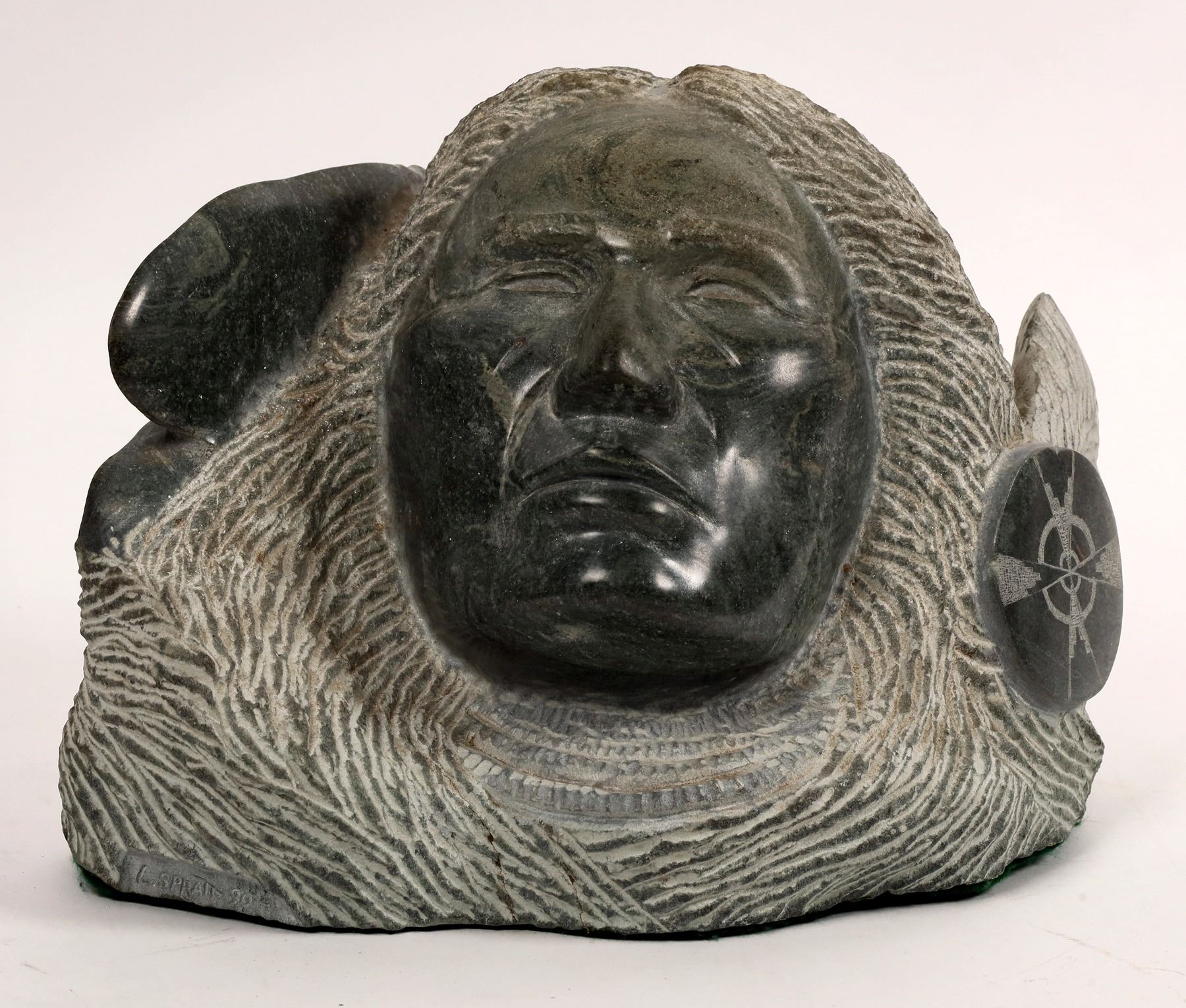 Hand carved greenstone sculpture of a Native American warrior. Unsigned, originally purchased from the now closed Out West Gallery in Coleville, CA. 8x11.5x9".
