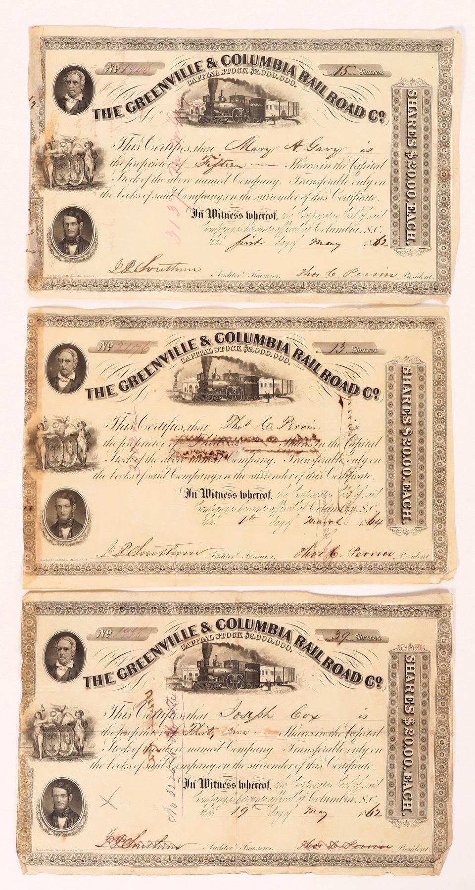 3 i/c c. 1862-64 Greenville & Columbia Railroad stocks. Locomotive vignette. South Carolina Ken Prag Collection