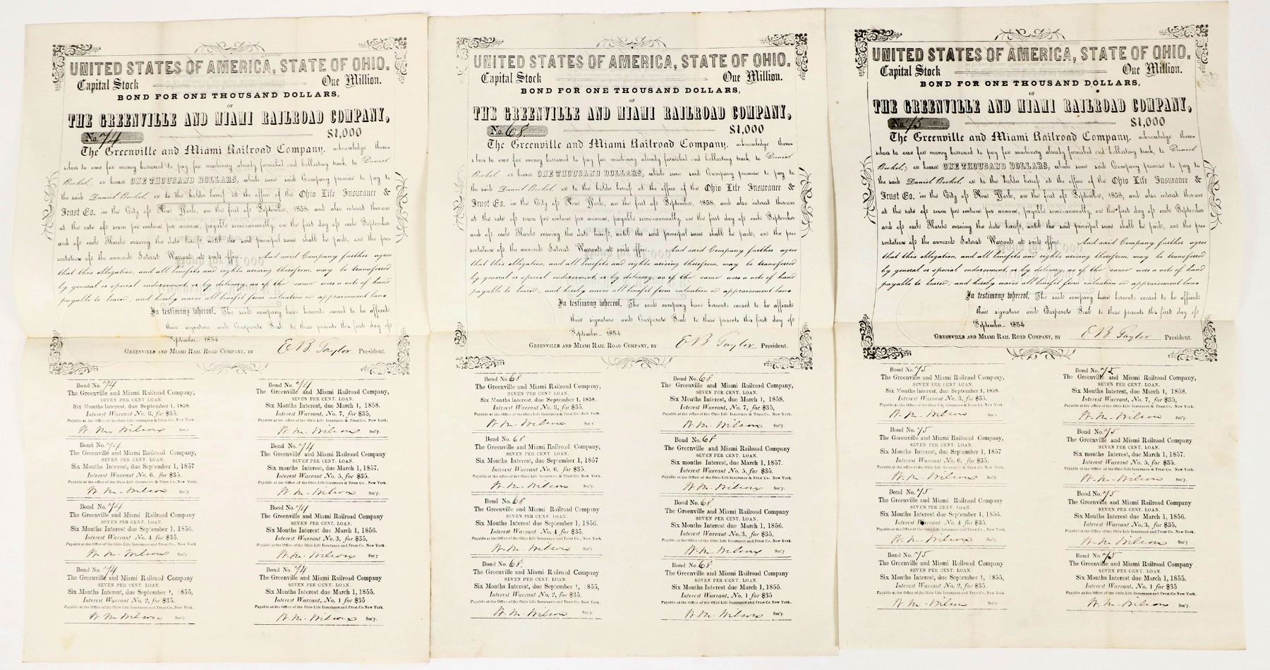 Lot of (3) $1000 Bond certificates, complete with coupons, set to mature in 1858. On the middle fold cover, is the Bond listed for $1000, at 7% interest, payable March 1st and September 1st. There is an embossed seal on the certificate base, above the coupons. Per our review, the Greenville and Miami RR was based out of Greenville Ohio, near Dayton. All (3) pieces are in very good condition, minimal folds, full size folded in half. Please see photos.