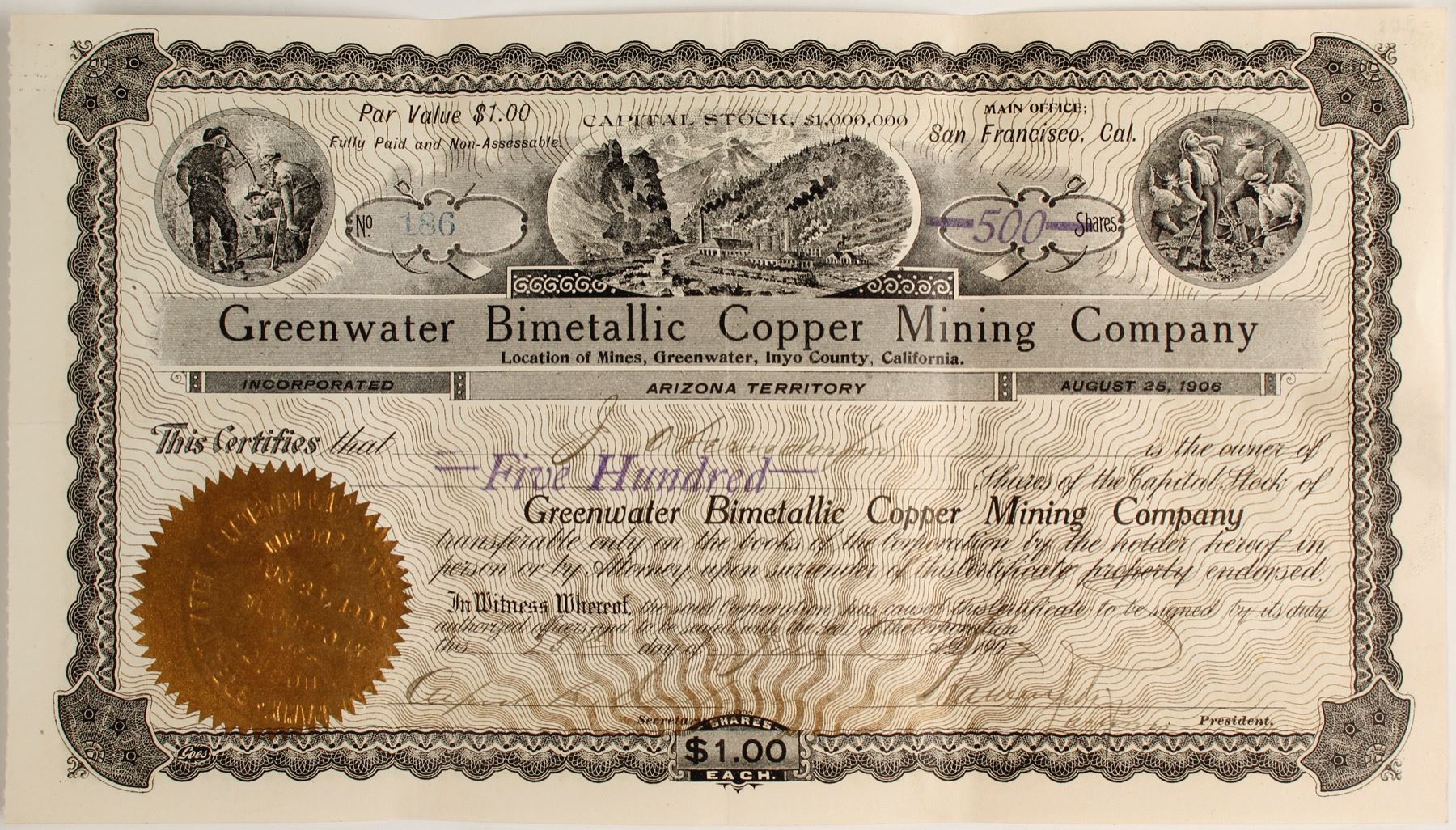 Cert. #186, issued for 500 shares in 1907 to J. Obendorfer. Signed by the acting president (ill). Inc. in A.T. Location of Mines: Greenwater, Inyo County, California printed on the masthead. Lands, 6 claims, adjoining the Furnace Creek Copper Co., showing a gossan up to 40' wide, giving assays of 3.6 to 37.9% copper. Sounds great but the company was idle by 1908 (Copper Handbook). Death Valley was seized by a copper frenzy according to Lingenfelter in his classic, "Death Valley and The Amargosa". Heralded as "the greatest copper belt the World has ever known!" George Graham Rice called Greenwater "the monumental mining-stock swindle of the century". Fine condition. Uncanceled. City: Inyo/ Death Valley State: California. State: California City: Greenwater Date: 1907 HWAC# 79041