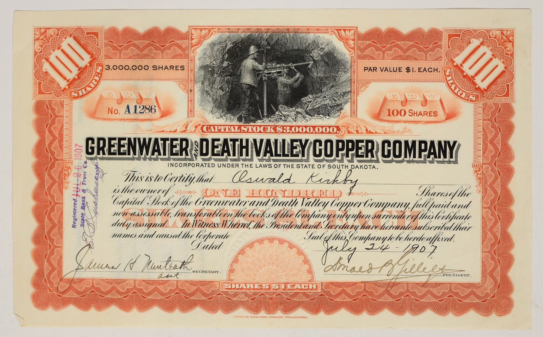 No. A1286, issued to golfer Oswald Kirkby for 100 shares in 1907. Signed by Donald B. Gillis as president. Not cancelled. Orange border, black print, and underground drilling vignette. Tasker Oddie was one of the company directors. Greenwater Copper Mines & Smelters controlled 95% of the stock of the company. This company actually had potential and was developing steadily in 1908, with 40 men employed. The company had 5 shafts in the Greenwater district including the Copper Glance No. 2. The main shaft was 700', with plans to go to 1600' with crosscuts at the 400' and 500' levels. The mine was systematically touted during the Greenwater boom, but the Copper Handbook noted that the company "is one of the few properties of promise in the district. Beautiful, engraved certificate by American Bank Note, N.Y. This company spent extra on this fancy certificate, and it's the only engraved certificate from Death Valley that we can think of other than the Montgomery Shoshone (also a hugely successful mine).