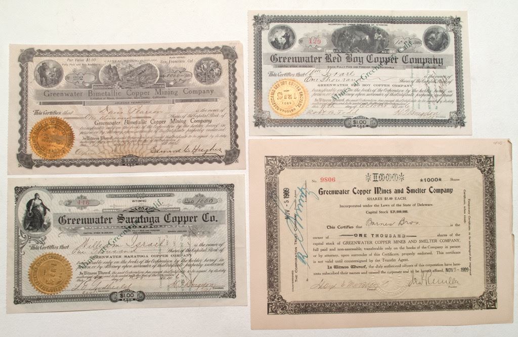 1) Greenwater Red Boy #129 for 1,000 shares to William Israel in 1906. Signed by Robert Todd and H. Bragdon. 2) Greenwater Bimetallic Copper Mining Company #292 to Davis Pearson in 1906. Signed by Edward Hughes and Dearborn(?). 3) Greenwater Saratoga Copper Company #446 for 1,000 shares to William Israel in 1906. Signed by H Bragdon and L Goodheld. 4) Greenwater Copper Mines and Smelter Company #9806 to Barnes Bros. in 1909. (Ames Collection) City: Greenwater State: California Date: 1906-1909 hwac# 3861