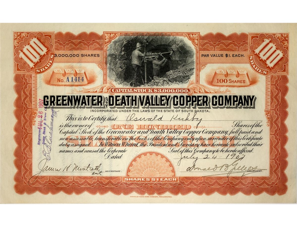 Cert. #1414, issued to Oswald Kirkby for 100 shares in 1907. Signed by Donald B. Gillis as president and James H. Monteath as ast. Secretary. Vignette of miners working underground. Beautifully engraved certificate by American Bank Note, Philadelphia. The company incorporated in South Dakota in 1906. Directors of the company included Tasker Oddie, Malcolm McDonald and C.B. Zabriskie. The company was controlled through ownership of 95% of the stock by the Greenwater Copper Mines & Smelters Co. According to the 1907 Copper Handbook, the company held 21 claims at Greenwater with ore bodies from 8' to 200' in width giving assays of 10 to 25% copper. One of the shafts was the Copper Glance No. 2, with a depth of 125'. The main shaft of 700' depth, was to be sunk to 1,600 ft. with crosscuts at the 400' and 500' level. Stevens commented that the company was "systematically touted, and vastly overestimated during the Greenwater boom", but was one of the few properties of promise in the district. The company employed 40 men in 1907. VF. Uncancelled.