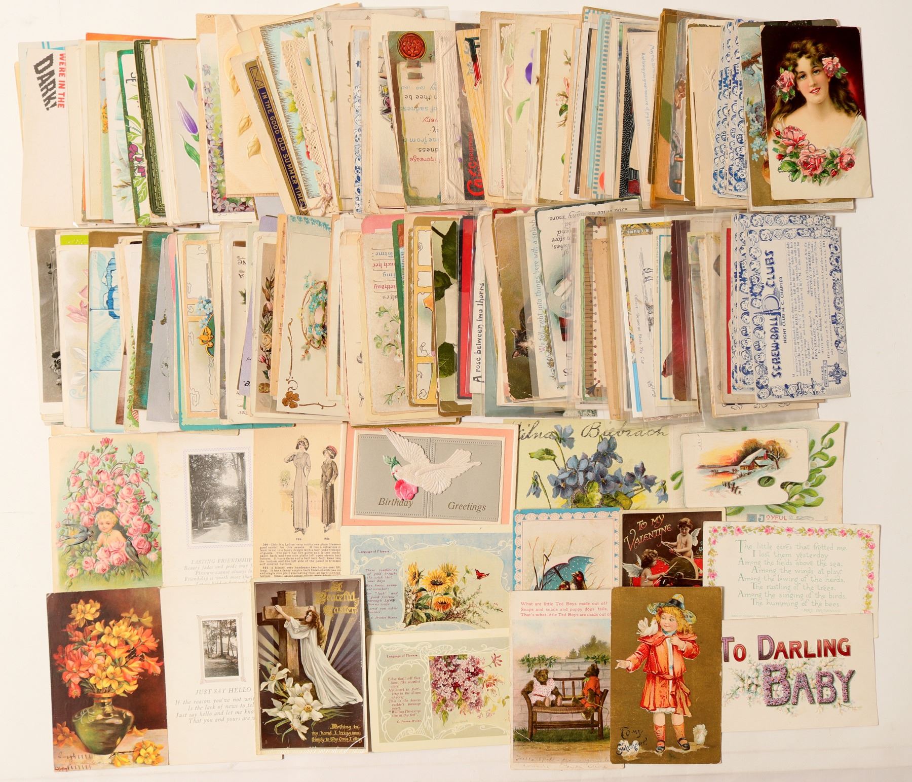 A nice collection of vintage greeting cards in post card form, mostly c1904-1910. Does not include Christmas, New Year's Day, Valentine's Day, St Patty's day, Thanksgiving, or Halloween. About 600-700 cards.