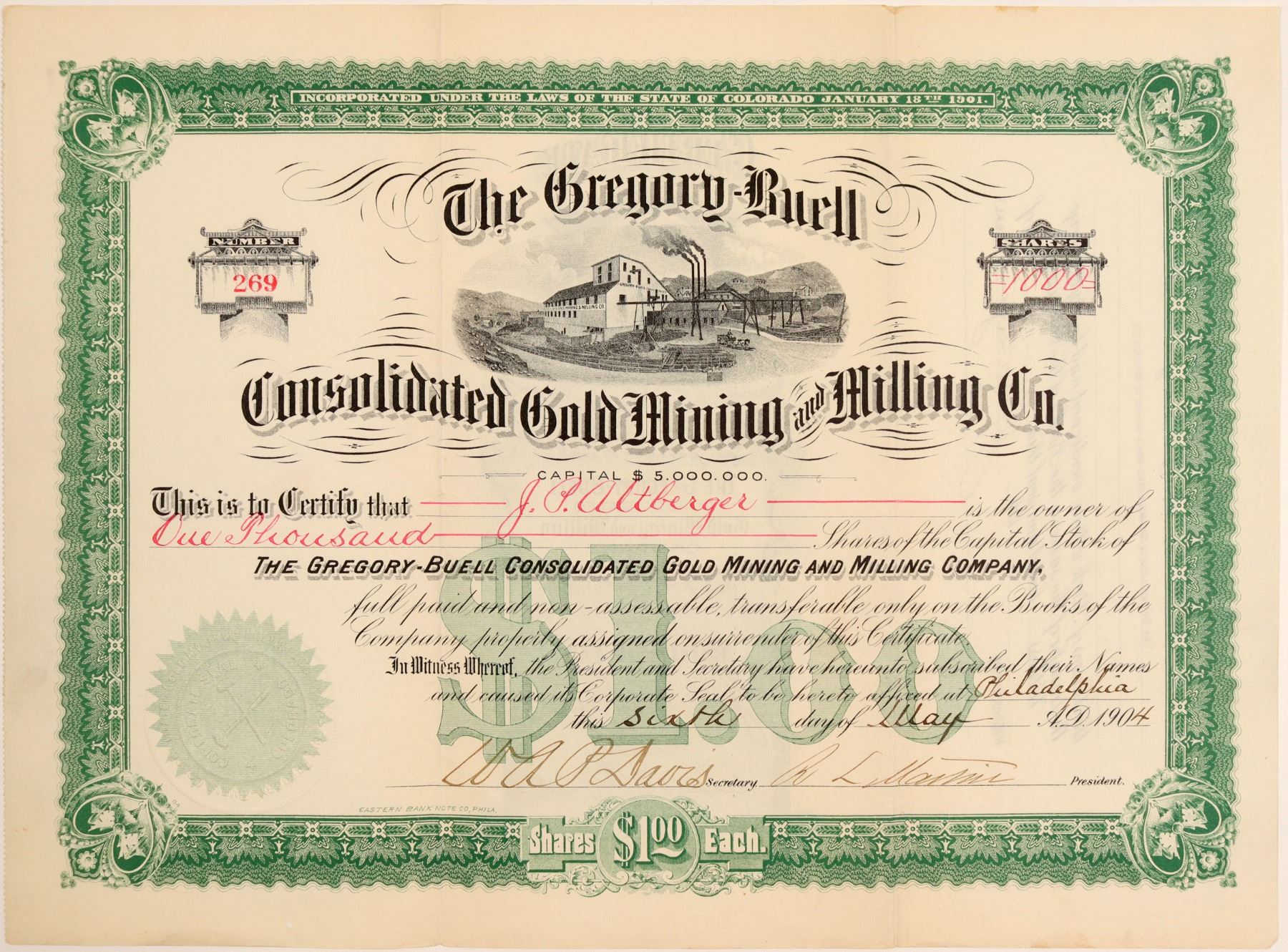 Inc. in Colorado in 1901. No. 269, issued for 1,000 shares to J.P. Altberger on May 6th, 1904 in Philadelphia. Signed by president RL Martin and secretary W.A. Davis. Not cancelled. Green border and seal, black print, and vignette of a mill building with the company's name on the side! Printed by Eastern Bank Note Co., Philadelphia. 9 x 12" Deep folds, a few stains on the reverse. According to the Mines Register (Vol. 5), the company owned the Buell Mine that had gold, silver, and copper ores. They have a 45-stamp steam mill that employs about 25 men (pg. 451).  City: Central City, Gilpin County  State: Colorado  Date: 1904