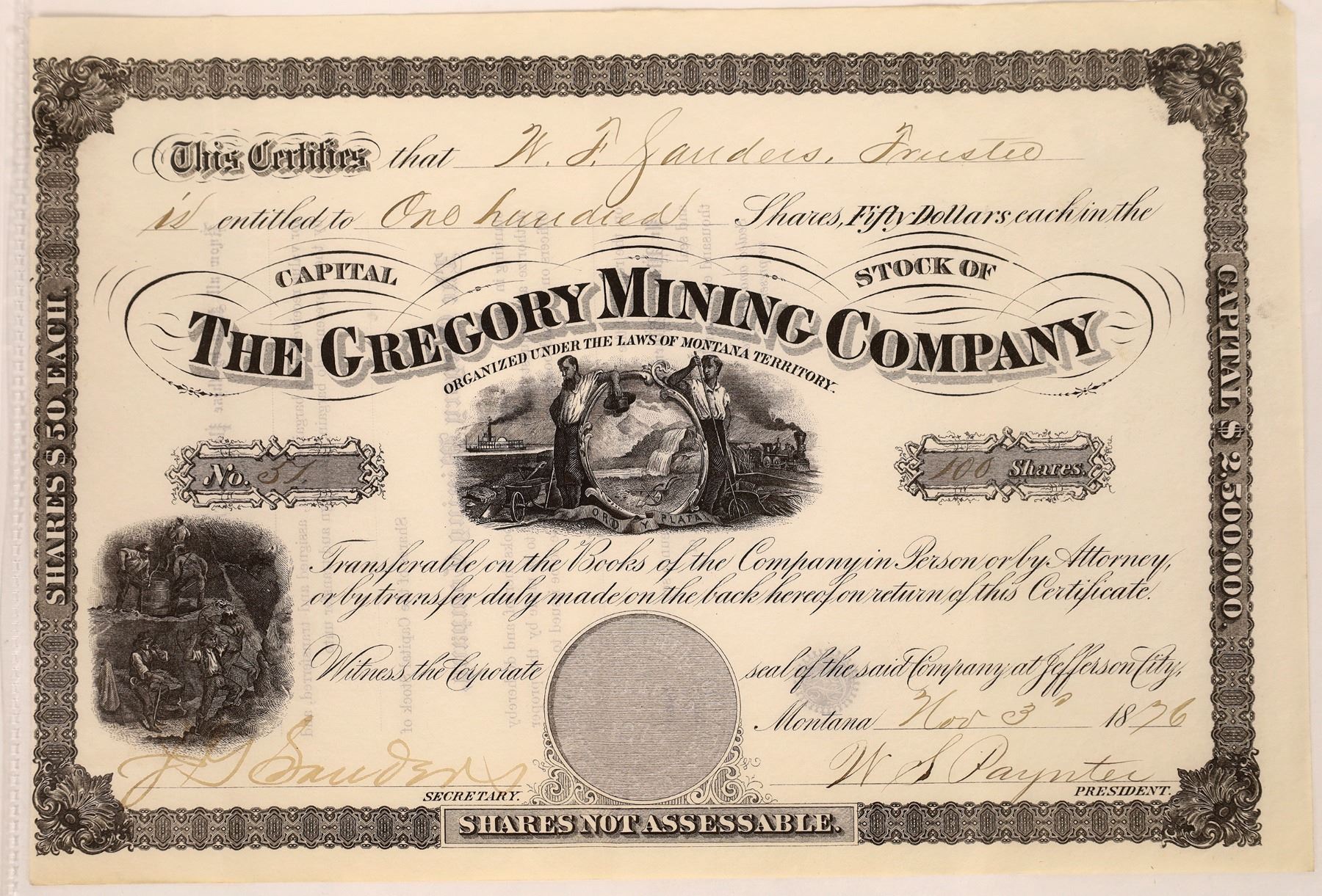 Organized in Montana Territory, 1876. No. 37, issued for 100 shares to trustee W.F. Sanders in Jefferson City, Montana, Nov. 3rd, 1876. Signed by president W.S. Paynter and secretary Sanders. Not cancelled. Black border and print, gray seal, and two vignettes: miners loading an ore bucket (left) and allegorical (center). No printer listed. Left border trimmed tight. Folds, bent corner. 7 x 10.5" This company owned the Gregory Mine in the Jefferson District, Jefferson County. In August 1876, they had 30-35 men employed, 450 tons of "first-class ore" had been shipped, with 2,000 tons of second-grade ore waiting. [Butte Weekly Miner, August 17, 1876}