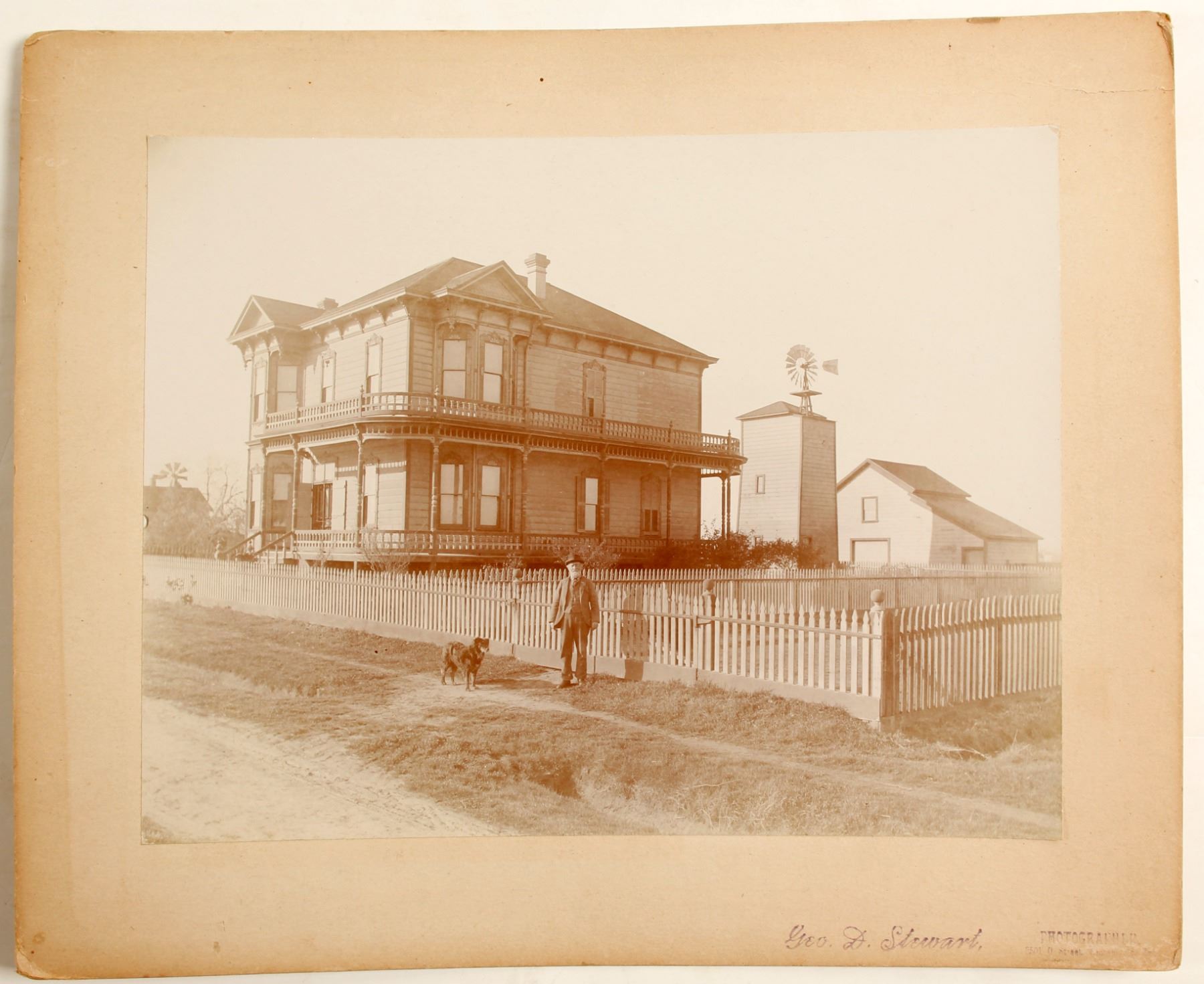 Approx 8 x 10" mounted photo of Gridley Lewis and his house in Oak Park, Sacramento, CA. Photo by Geo Stewart