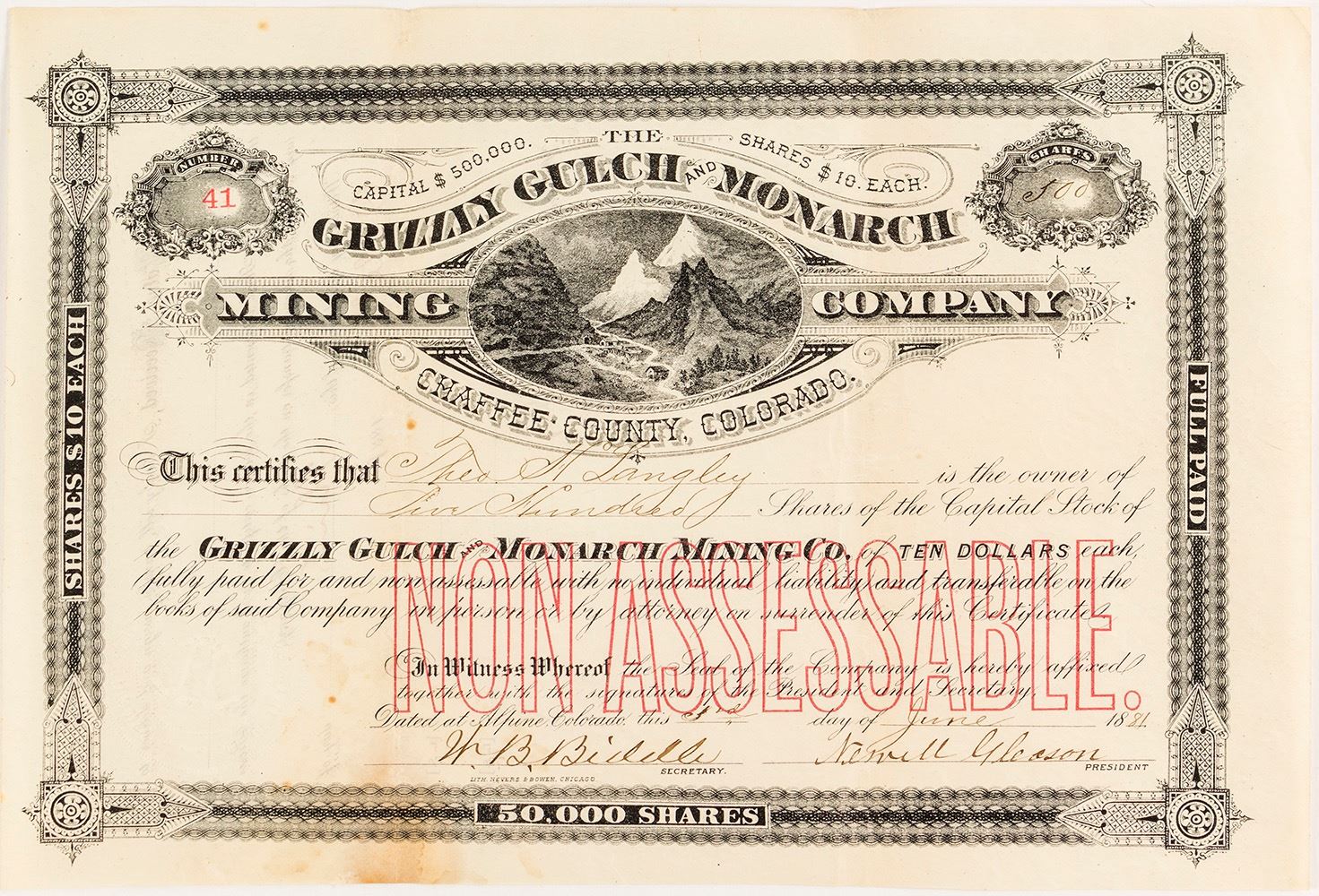 I/U to Theo. Langley #41 500 shares signed by president Gleason. Some bottom toning. 7.5" x 11.25". Grizzly Gulch was located 4 miles from Alpine. Date: Location: Chafee County, Colorado HWAC # 54349