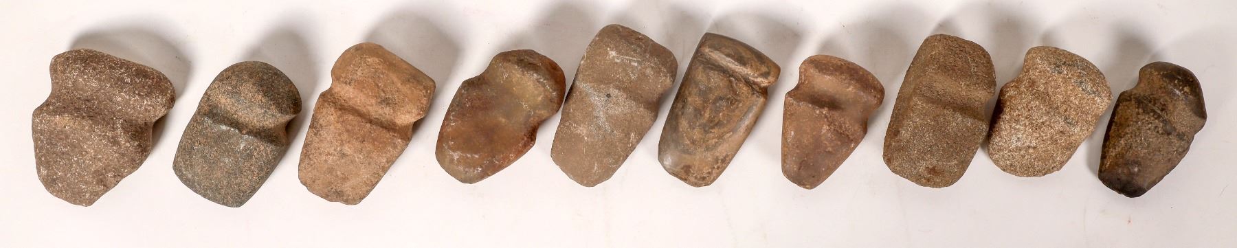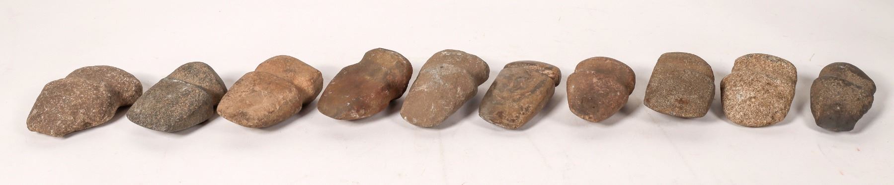 This collection of grooved axes range from 4.0 to 4.75 in. in length. THere are five with 3/4 groove and five with a full 360 groove. There are three from Illinois, kentucky, Kansas polished tip, and Oklahoma. Three are not identified by location. From the Bracken collection. Please see photos for details.