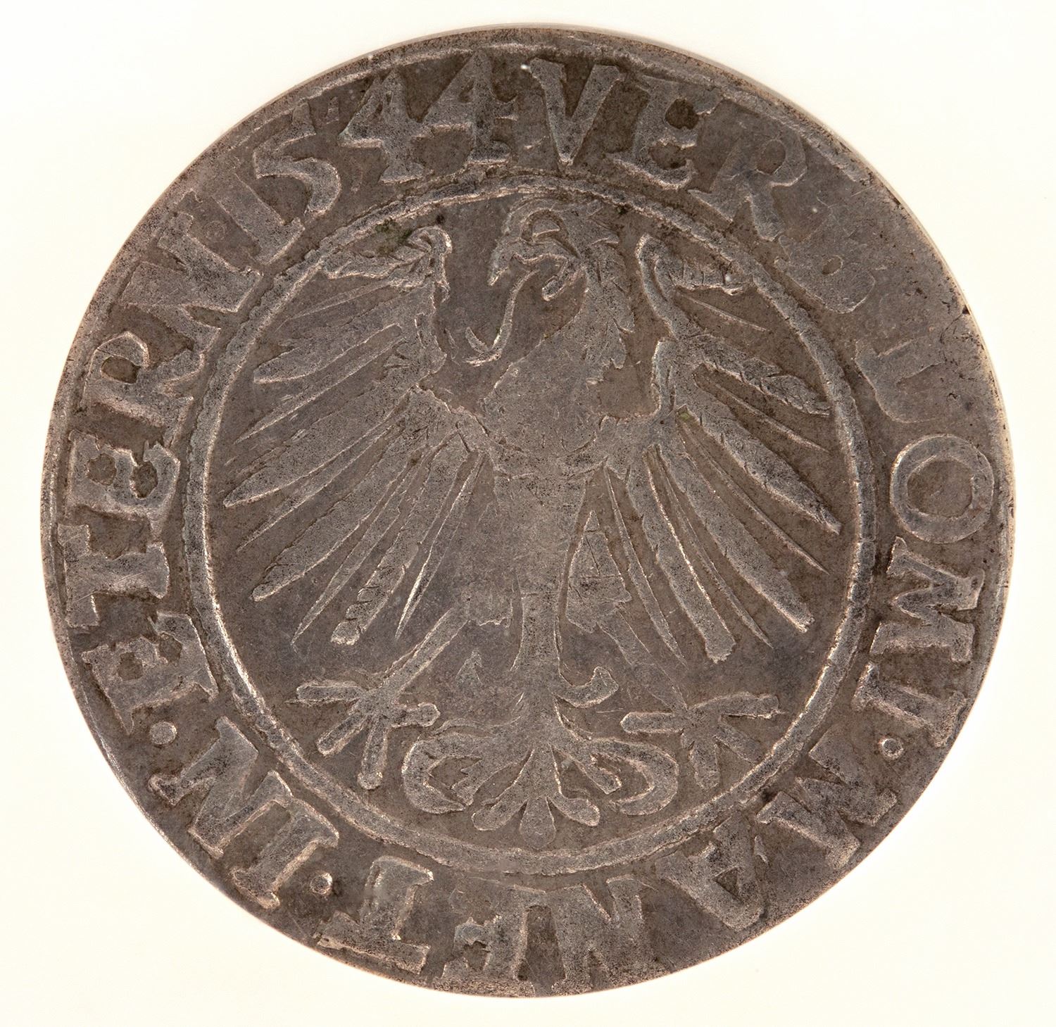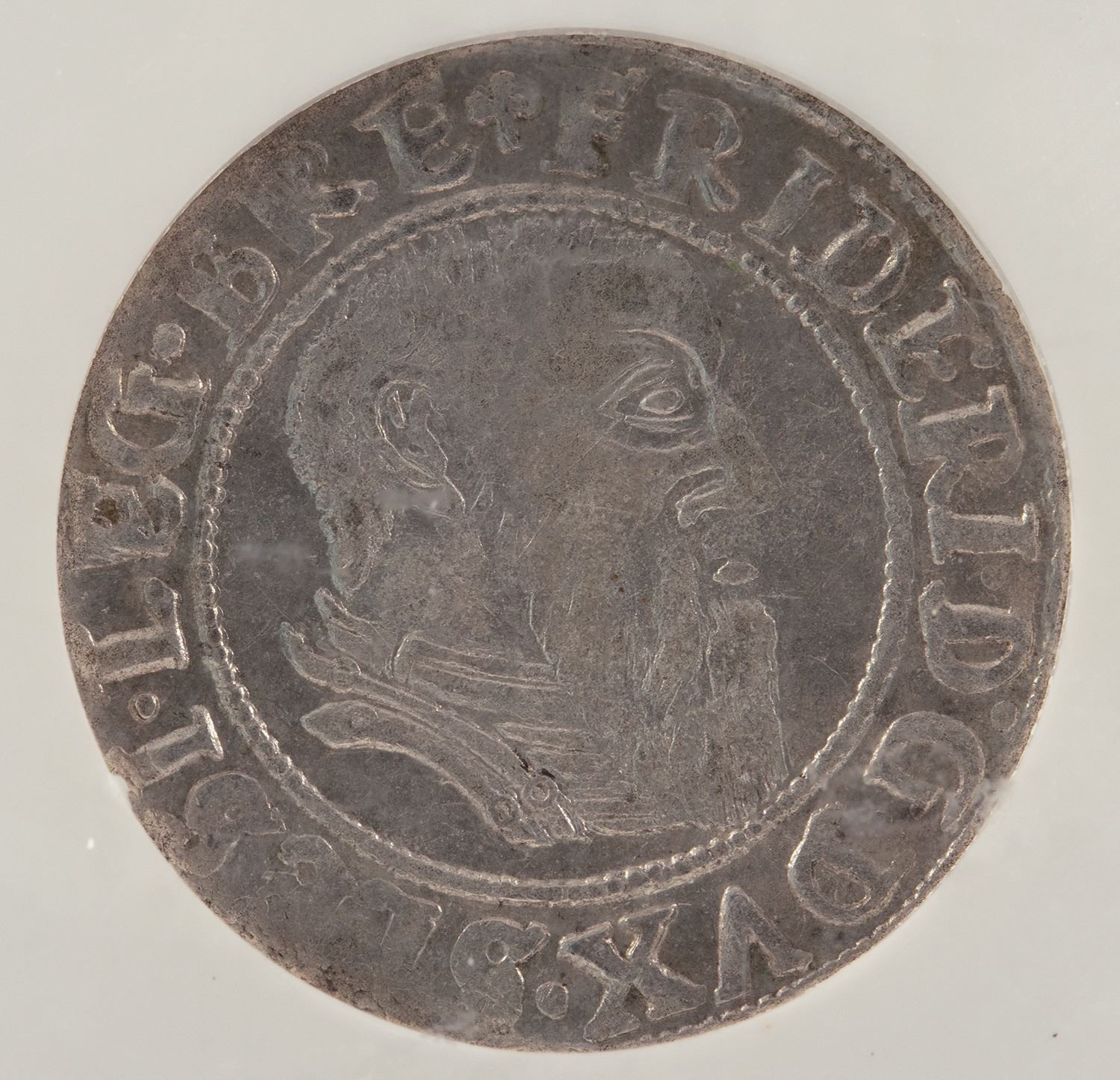 Friedrich II silver coin. Obverse: Larger, older head to right. Obverse Legend: *FRIDERI. D. G. DVX. SLESI. LEG. BRE. Reverse: Silesian eagle in circle, legend ends with date. Reverse Legend: VERB. DOMI. MANET. IN. ETERN. NGC certified AU 55.