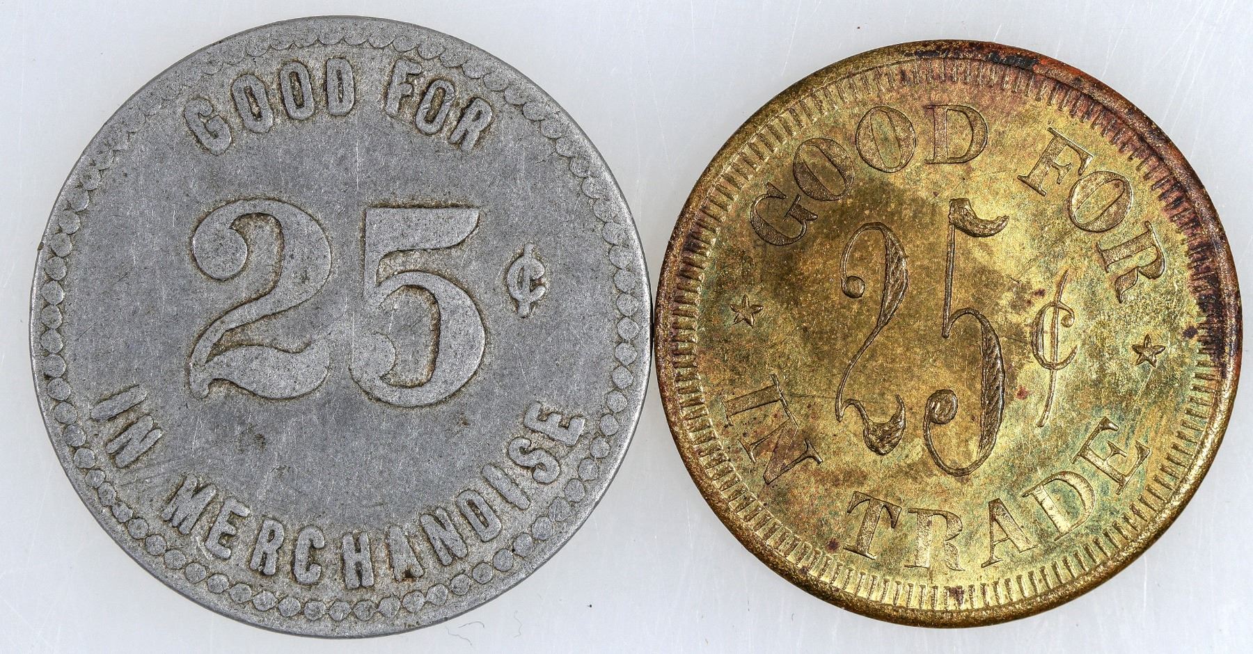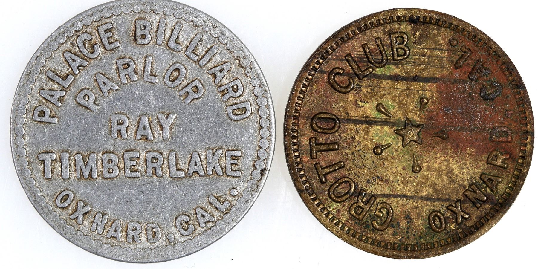 Lot of two tokens from the Ventura County town: 1) PALACE BILLIARD / PARLOR / RAY / TIMBERLAKE / OXNARD, CAL. // GOOD FOR / 25¢ / IN MERCHANDISE; Al., rd., 26 mm. 2)