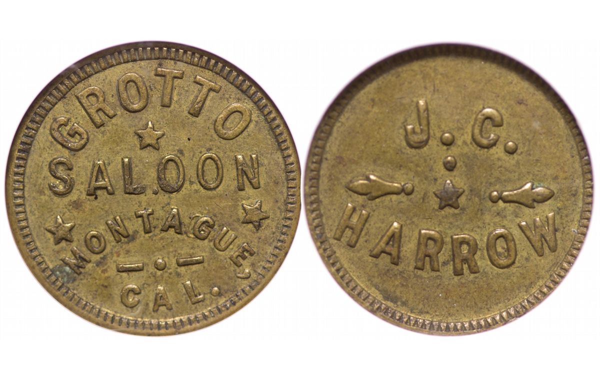 Obv.: Grotto / Saloon / Montague / Cal.; rev.: J.C. / Harrow. Br., 20mm, NGC AU58.
