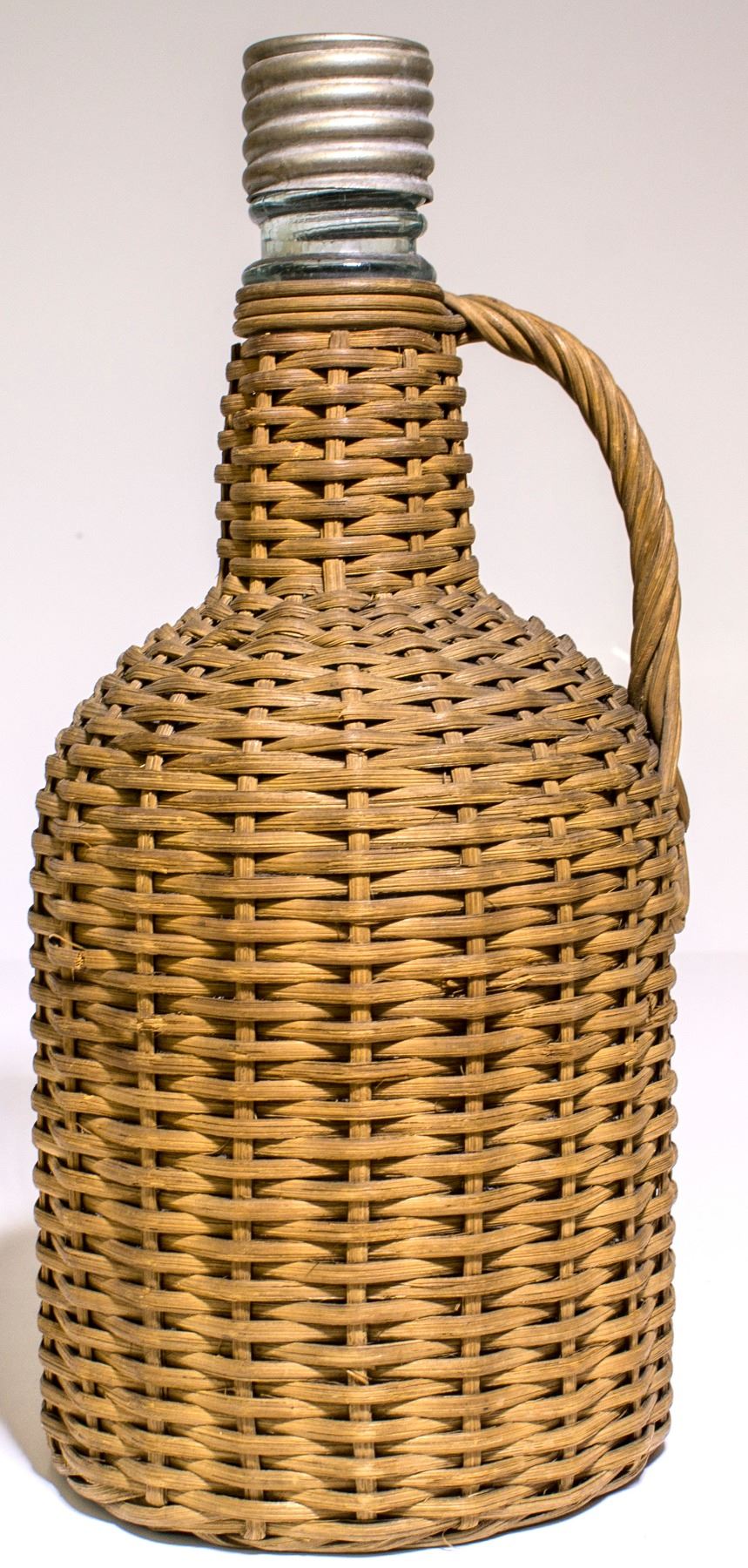 Old Style , handled , wicker whiskey bottle. 9 1/2" Tall x 4 1/4" wide. Perfect condition , on the wicker. Also, very unusual to find a ground top and original cap , threaded bottle. Great table , or mantle display item. Most likely, a barn or attic find. Perfect condition. ( RH).