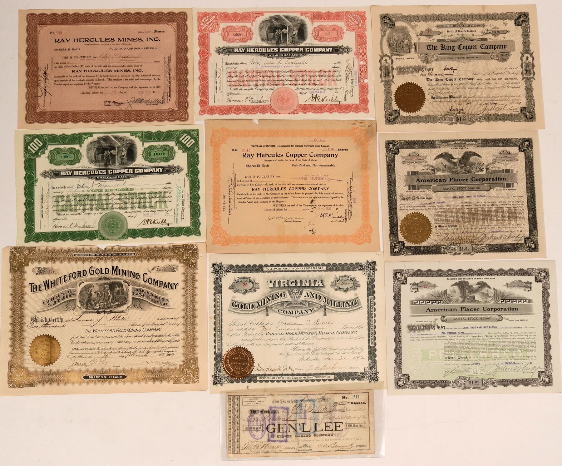 Lot of 10. 1) The first three are Ray Hercules Copper Company. 1) # A5803 for 50 shares to Ida Daniell. 1916. Signed by Dunham and president Reilly. Bright red. Double tunnel mining vignette. American Bank Note Printer. Dog ear left and two holes for storage. 2) Same as number one but bright green. 1918. Issued to John Macneil. Pin holes. No other issues. 3) Orange. # 3142, Autosigned by Reilly. Discoloration and one large tear. 4) Ray Hercules Mines Inc. # 3580 for 25 shares to Peter Cappuccilli. reddish brown. American Bank Note. 5) General Lee Silver Mining Company. # 619 fir 1000 shares to CE Gillette. SIgned by president DA Bennuell and Thomas A Atkinson. Dateline San Francisco 1878. Incorporated October 1877. Location: Globe District, Pinal County. Not cancelled. 6) Whiteford Gold Mining Company. No. 176, issued for 2,000 shares on March 16, 1899 to L.J. White. Signed by Crawley (vice president) and James White (secretary). Punch cancelled. 7)Virginia Gold Mining & Milling Company. Arizona Territory, 1891. No. 25, issued for 500 shares to William Biedler on Jan. 21, 1892 in Baltimore. Signed by president JS Barbour and the treasurer. 8) King Copper Company from Jerome. Number 15 for 10,000 shares to SM Boyd. Singed by Boyd and president (?). Six small mining vignettes on one larger. Not Cancelled. Small rips at fold edges. 9) Brown American Placer from Cocomino. 1911. #389 for 500 shares to Mrs. Mary Watson. Eagle Vignette. Not cancelled. Very nice condition. 10) Green variety of American Placer .