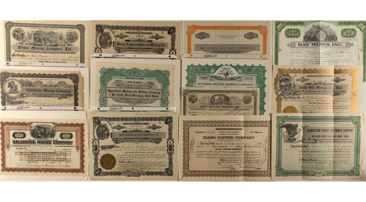 Thirteen different stocks from Idaho miners. 1)Hybar Mining Co. Ltd. (ID), issued in 1904. Three mining vignettes. Unc. 2)Blackstone Mining and Power Company, Ltd. (ID), issued in 1907. Big Creek Canyon, Bear Lake County, Idaho printed on the masthead. Eagle vignette. Some tears in right border. Unc. 3)Caledonia Mining Company (ID), issued in 1909. The company owned 50 acres adjoining the Bunker Hill & Sullivan MC. Ore was lead-silver. Operated near Mullan. Piece missing at top right corner and small chink in right border. Stamp cxled. 4)Caledonia Mining Company (ID), issued in 1923. Different format certificate. Miners underground. Very attractive. Unc. 5)Boise Exploration and Mining Co. (AZ), issued at Rockford, Illinois in 1909. Tears at folds repaired on the front with archival tape. Unc. 6)Gold Hill Mining Co., Ltd. (ID), issued in 1911. Most likely operated in the Le Lande mining district, Shoshone Co. Mining vignette at top left. Unc. 7)Hypotheek Mining and Milling Company (ID), $100 First Mortgage Gold Bond issued in 1914. No coupons attached. Unc. 8)Reindeer Queen MC (ID), issued at Wallace, ID. in 1924. The company operated 15 Mullan copper belt claims as well as 6 Reindeer claims. It was a consolidation of the Copper Queen and Reindeer Queen companies. Seven mining vignettes. Unc. 9)Gem State Mining Co. (ID), issued at Spokane, Wash. in 1924. Operated in the Hunter mining district 3 1/2 miles from Mullan. Ore was silver-lead-gold. Three mining vignettes. Unc. 10)Idaho Copper Company (ID), issued in 1926. Operated the Red Ledge, and South Peacock mines in the Seven Devils mining district, plus the Iron Dyke mine in Baker County, Oregon. Rough right edge with tear in the border. No vignette. Unc. 11)Best Chance Gold Mines Corporation (ID), issued in 1937. Operated in the Elk City district, Idaho County (Mines Register, 1937). No vignette. Unc. 12)Sunrise Silver-Lead Mining Company (ID), issued in 1920. Most likely operated in the Silver Valley mining district. Issued at Osburn, Idaho, located in Shoshone County. 13)Day Mines, Inc. (ID), issued in 1973. The company became and Idaho corporation in 1947 consolidating 12 mining companies in Silver Valley, the most valuable being the Tamarack and Custer (U. of Idaho Archives). Allegorical males holding a pick and a hammer. Unc.City: County: State: IDDate: