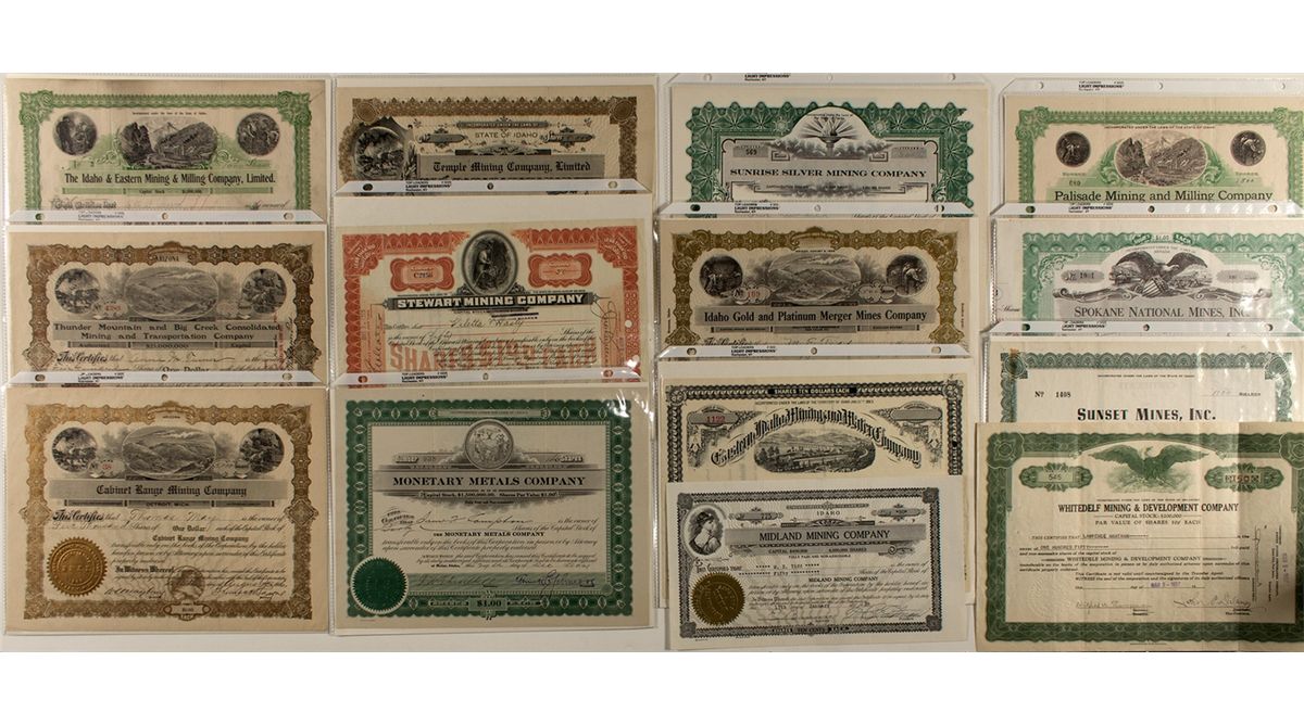 Fourteen different Idaho mining stocks 1)The Idaho Eastern Mining & Milling Company, Limited (ID), issued in 1903. Three mining vignettes. Red pen cancelled. 2)Thunder Mountain and Big Creek Cons. Mining & Transportation Co. (AZ), issued in 1905. Three mining vignettes. Unc. 3)Cabinet Range Mining Company, Detroit, Michigan (AZ), issued in 1906. Operated on the West side of the Priest River, about 10 miles north of Priest Lake, Kootenai Co. A silver mine carrying up to 100 ou. of silver per ton, plus copper and lead. Three mining vignettes. Unc. 4)Temple Mining Company, Limited (ID), issued at Burke, Idaho in 1907. Mining vignette at top left. Unc. 5)Stewart Mining Company (ID), issued in 1915. Operated the Stewart mine, a silver-lead mine at Kellogg, Idaho. Nice vignette of a miner operated a drill underground. ABN. Unc. 6)Monetary Metals Company (ID), issued at Boise, Idaho in 1921. Operated the Washington and Sub Rosa gold-silver mines, near Idaho City, Boise County. Idaho state seal vignette. Unc. 7)Sunrise Silver Mining Company (ID), issued at Osburn, Idaho in 1928. Torch vignette. Hole cxls. 8)Idaho Gold and Platinum Merger Mines Company (NV), issued in 1928. Principal place of business, Bruneau, Idaho printed on the left margin. Three mining vignettes. Unc. 9)Whitedelf Mining & Development Company (DE), issued in 1937. Operated the Lloyd & Pugh mines, silver-lead, 1 1/4 miles from Clark Fork, Bonner County. Eagle vignette. Unc. 10)Midland Mining Company (ID), issued in 1938. Allegorical female at top left. Unc. 11)Palisade Mining and Milling Company (ID), issued in 1938. Operated in the Pine Creek district, Kootenai County (Mines Register, 1937). Three mining vignettes. Unc. 12)Spokane National Mines, Inc. (NV), issued in 1962. Operated in Idaho, Montana and Washington state (Mines Register, 1963). Eagle vignette. Pen cxled. Stub attached at left. A uranium miner. 13)Sunset Mines, Inc. (ID), issued in 1955. No vignette. Pen cxled. Brown glue marks. 14)Eastern Idaho Mining and Water Company (Idaho Terr). UI. 188X. Would have been issued at Blackfoot, Idaho. The town was a stage and rail stop for the Utah Northern R.R., later the Union Pacific. The town of Blackfoot began in 1879 and became the county seat. This company may have tried to become a custom mill, also trying to procure some of the local water rights. Not mentioned in Burchard. Large oval train vignette.City: County: State: IDDate: