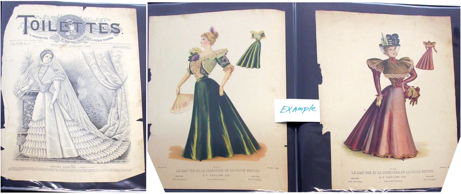 Beautiful collection of women's fashions, all pictures in very good condition, kept in plastic covered pages in large book. Some pictures are 11" x 16"; and some are 9.25" x 12". The styles are from period of 1803-1897, from A Descriptive Journal of New York, London, Paris , & Berlin Fashions. Copyright 1896, by Toilettes Publishing Company. Date: 1813-1897 Location: zEurope HWAC# 56746