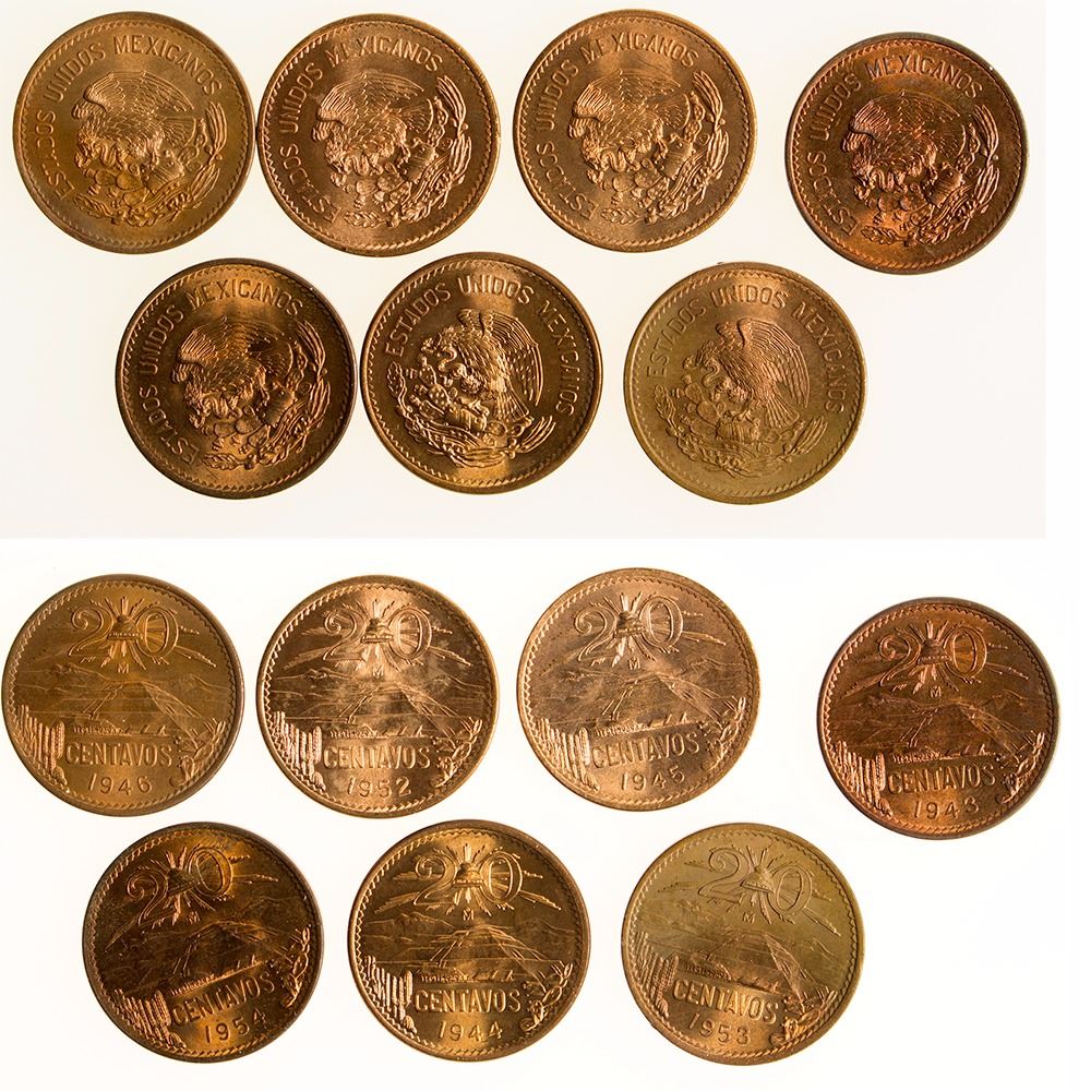 Lot of 7 coins: KM 439, bronze, 28.5mm. All brilliant uncirculated, uncertified. Dates: 1943, 1944, 1945, 1946, 1952, 1953, 1954. State: Mexico City: Date: FHWAC#: 41954