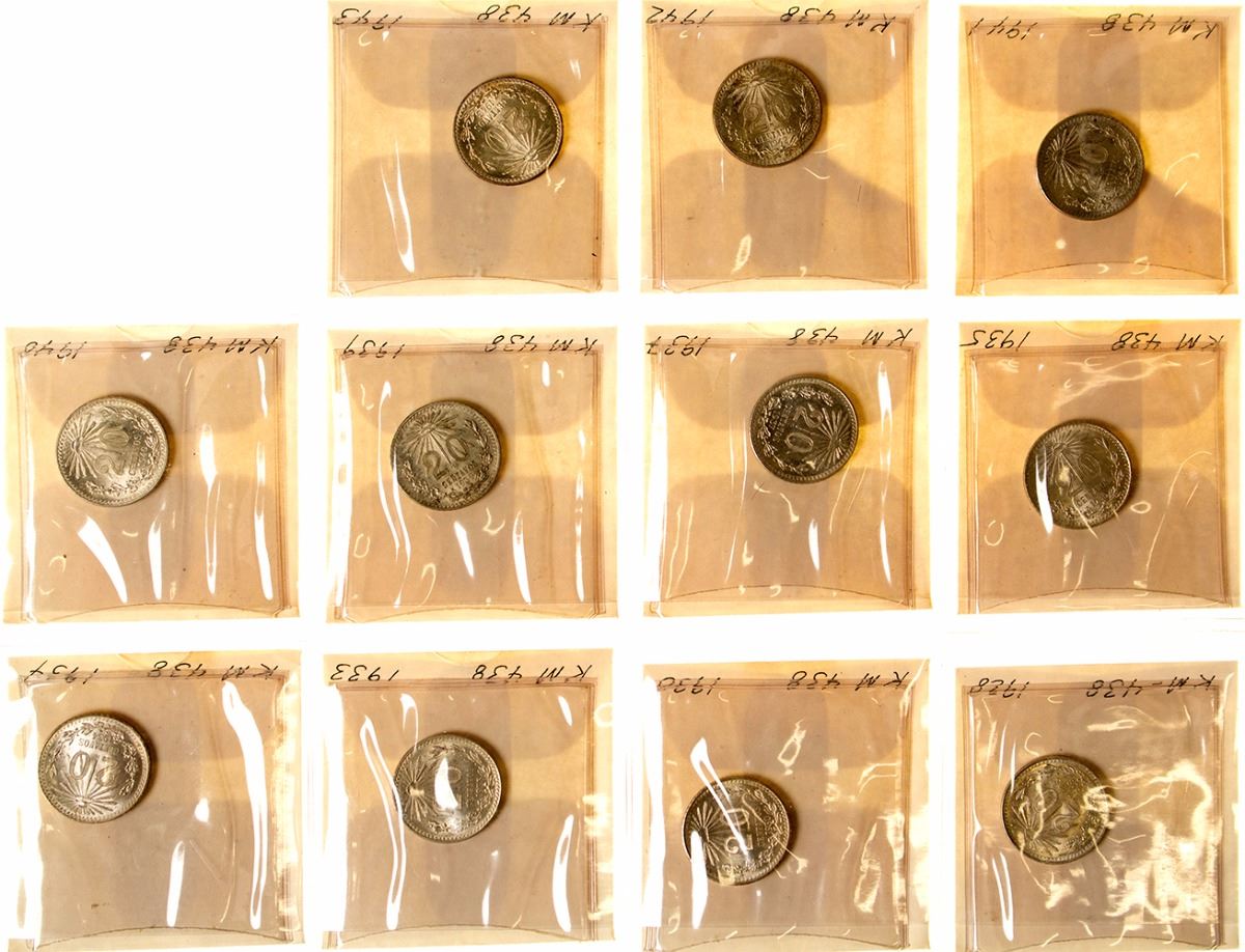 Lot of 11 KM # 438, 1928-1943; .720 fine silver, .0772 oz. ASW, 19mm. All uncirculated. State: Mexico City: Date: FHWAC#: 42208