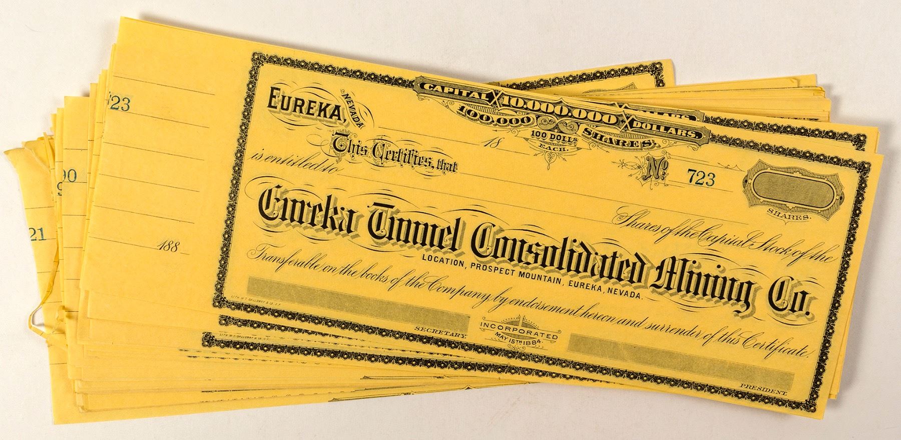 Forty two unissued stock certificates from the Eureka Tunnel Consolidated Mining Co. incorporated May 15, 1884 at Eureka Nevada. 4 1/4 x 10 inches.