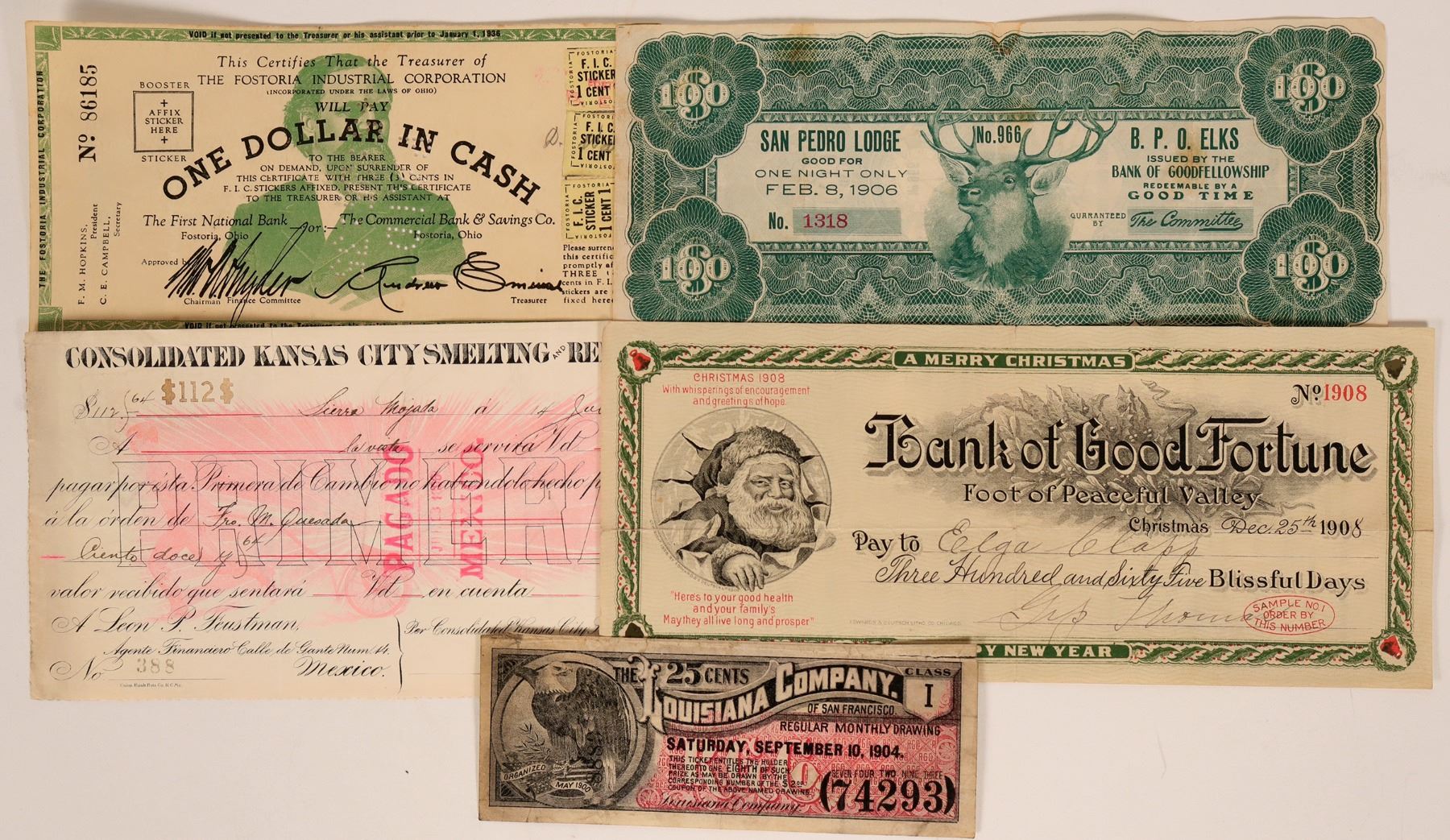 Lot of five. Includes One Dollar In Cash to the bearer from the Fostoria Industrial Corporation, scrip for $100 of value at San Pedro Lodge #966, B.P.O. Elks, Feb. 8, 1906. This scrip looks just like currency. Great picture of a large elk at center. The money was to be accepted for one night at Elk's Gulch for roulette, poker, craps, faro, etc. Twenty five cents from the Louisiana Company, a Merry Christmas in 1908 from the Bank of Good Fortune and an 1896 draft from Consolidated Kansas City Smelting & Refining Co. round out this lot.