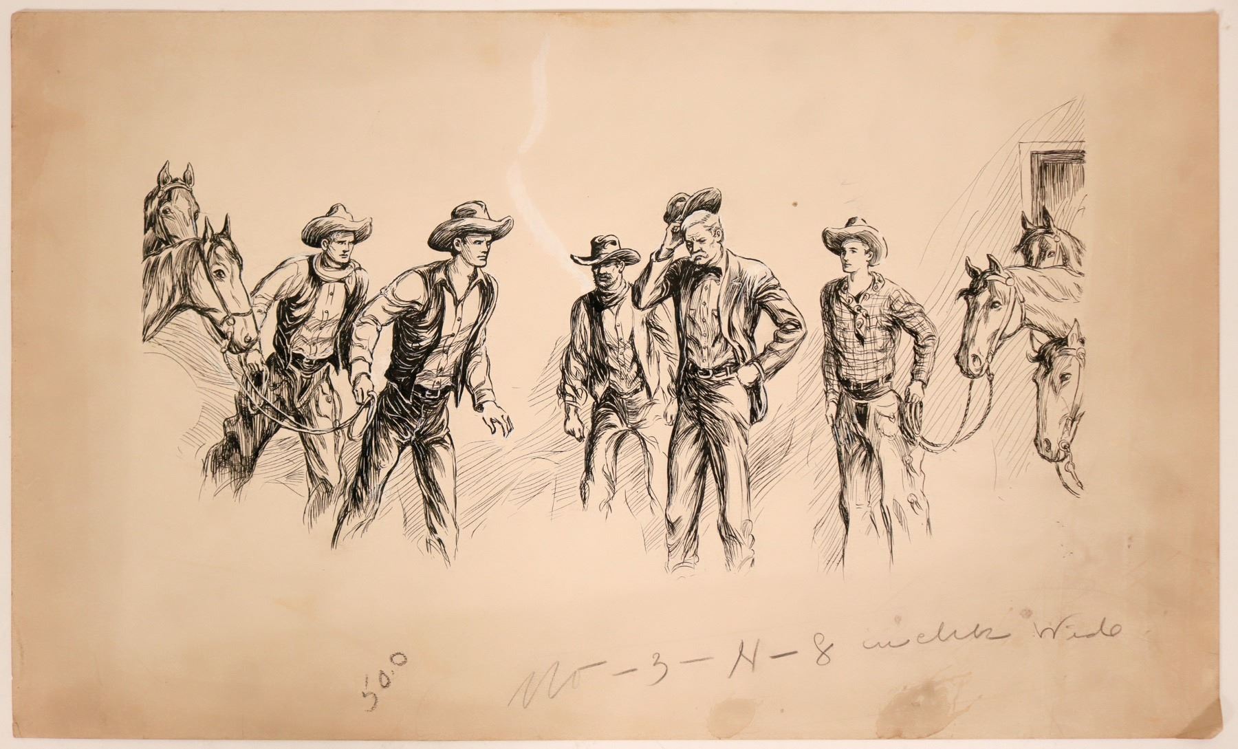 Ink drawing of group of men pondering, with horses, 8" x 16".