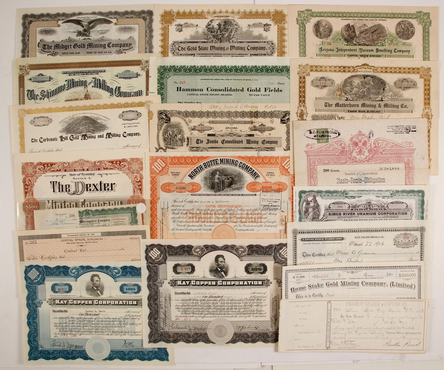 Lot of 19 different. Included: Sherman Dev. Co. (1918, cxl); Shinumo Mining & Milling Co. (unissued, 190_); Murray Creek MC (Calaveras County, unissued); San Doming GMC (Calaveras County, 1906, not cxl); Kings River Uranium Corp. (unissued); two different for Kay Copper Corp. (1924 & 1928, Lincoln vignette); North Butte MC (1926, cxl); Parrot Silver & Copper Co. (1886 transfer); Dexter MC bond (1906); 1893 foreign bond; Arizona independent Vacuum Smelting Co. (1906, cxl); Jumbo Cons. MC (1910, damaged); Gold State M&MC (unissued 1890s); Home Stake GMC (unissued 1800s); Midget GMC (unissued); Carbonate Hill GM&MC (unissued); Matterhorn M&MC (1907); and Hammon Cons. Gold Fields (1923, cxl). Date: City: State: HWAC# 77637