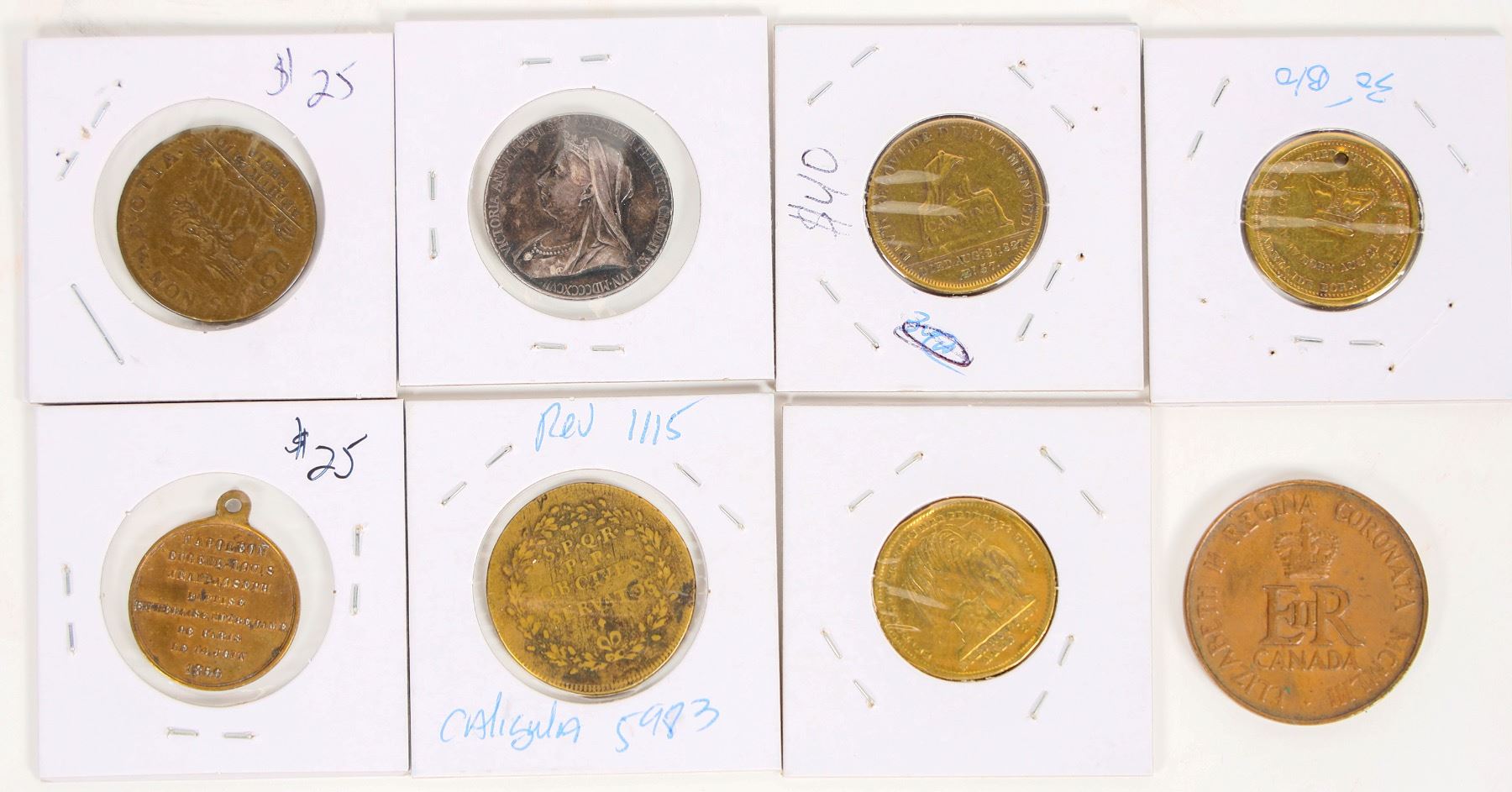 This group of eight small medals, 22 to 38mm in diameter, commemorate various people and events such as the 1817 death of Princess Charlotte at age 21, Louis XIV, Queen Victoria's Sixtieth anniversary of rule, Elizabeth II Coronation, William IV & Queen Adelaide Coronation, the death of anti-slavery advocate George Canning, the Roman Emperor Caligula, and the baptism of Napoleon III.