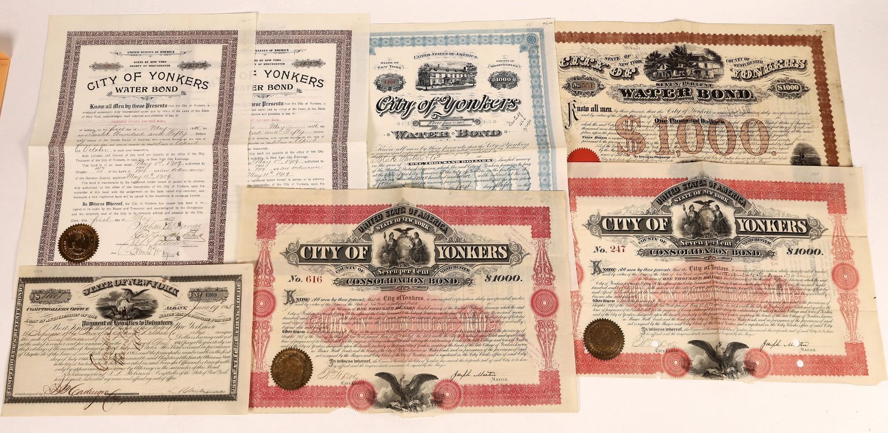 Lot of 7. Includes: State of New York, 1865, Comptroller's Revenue Bond; two City of Yonkers Consolidation Bonds, $1,000, 1875; and four City of Yonkers water bonds, three varieties, issued 1875, 1895, 1945 and 1946.