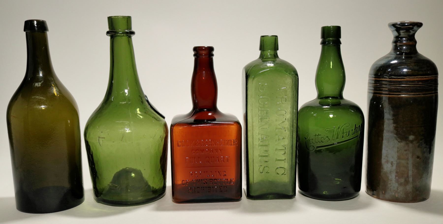 Consists of ceramic decanter, Schiedam Aromatic Schnapps, Catto's Whiskey, Mount Vernon Rye Whiskey, Carl Sbad brown and an unidentified green.