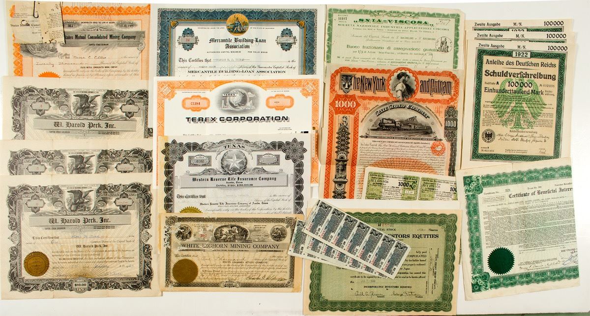 20+ Varied group! Earliest is 1894 New York and Putnam Railroad Company bond. Latest is Terex Corporation stock. Includes a group of German bonds from 1922, Republic of Bolivia coupons (c.1930s), Italian stock from 1939, and assorted US stocks from the 1920s, 30s and 40s. Please inspect. City: State: United States Date: 1894-1967 hwac# 34742