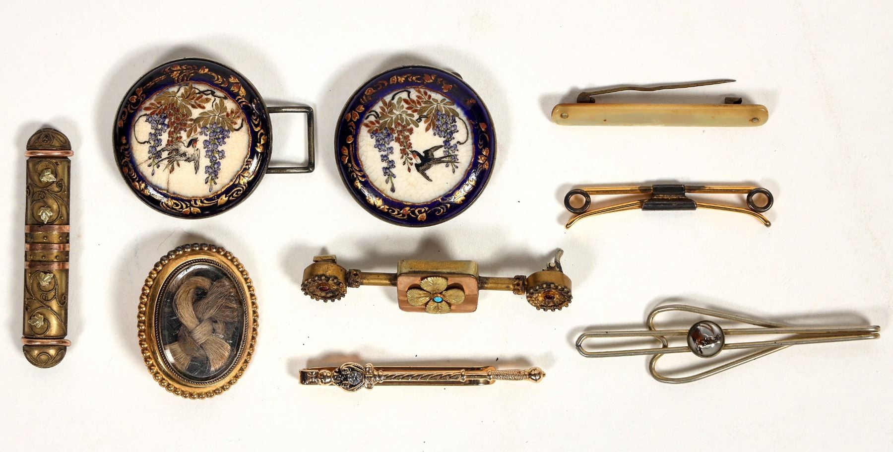Lot of 10. Broach with a lock of hair inside, two small buckles w/scenes of birds, small leather case, four possible "hair" clips. and two other pins.