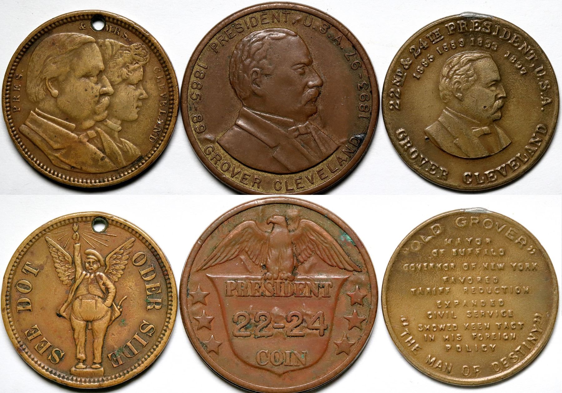 Lot of three different Grover Cleveland commemorative copper and brass medals, celebrating the 22nd and 24th president. All approximately 1 inch in diameter. Includes a token featuring Mr. and Mrs. (Frances) Cleveland, with "SEE DOT ODER SIDE," on reverse; busts of Cleveland with "Old Grover, Mayor of Buffalo, Governor or New York ... The Man of Destiny;" and "President 22-24 Coin," on reverse of the other two. Good condition.