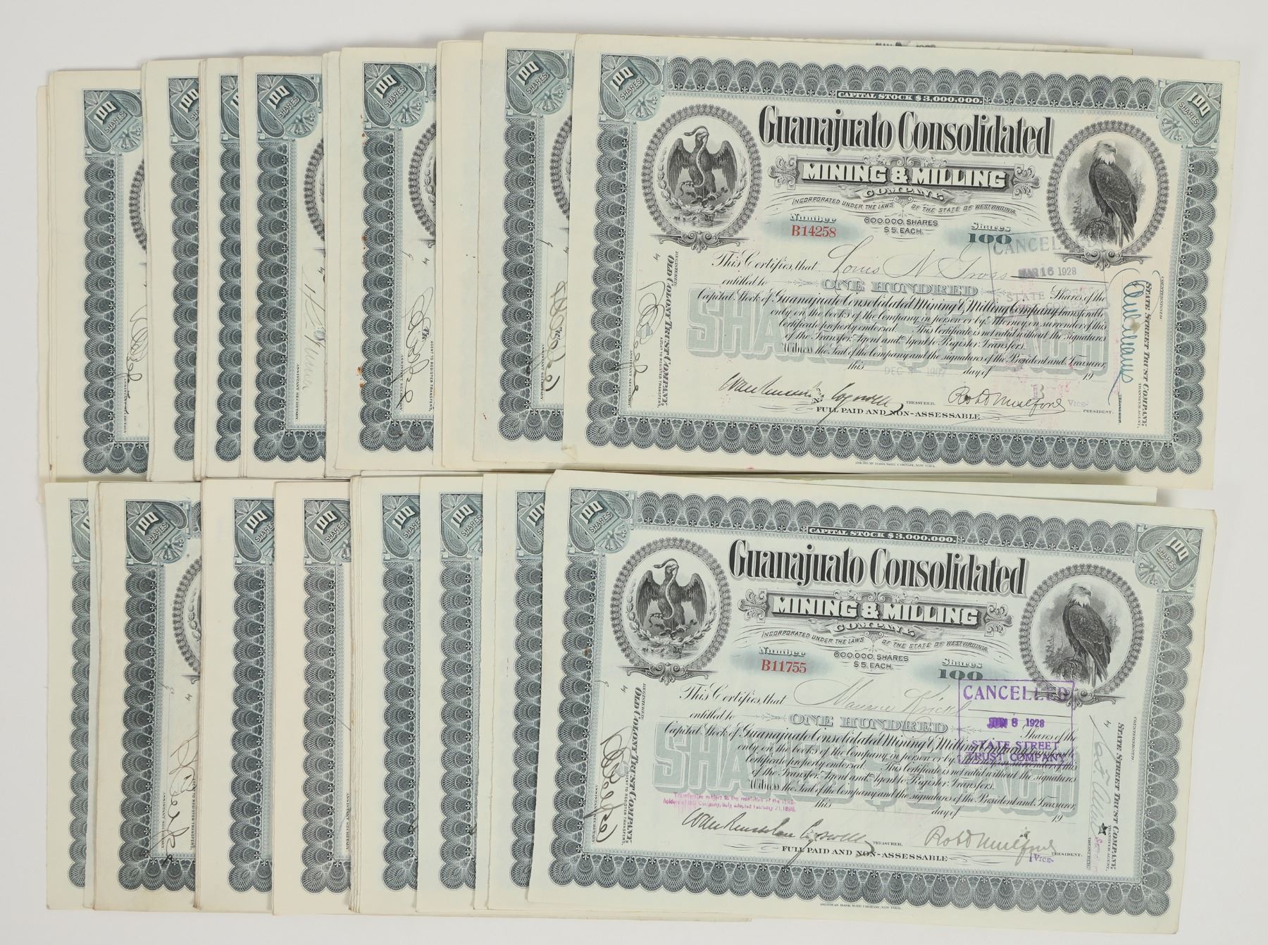 About 160 Guanajuato Consolidated Mining and Milling Company Stocks issued between 1900 and 1930, cancelled and some endorsed/revenue stamped on reverse. Guanajuato Consolidated M&M Co. was incorporated in Colorado in 1898 for the purpose of taking over and working the Sirena mine, on the Veta Madre of Guanajuato, but soon-after purchased 6x more property in and area known for productive mining since the 16th Century, and by 1906 the company was operating many mine, plus it owned 10% of the Concordia and Rayas Company, one of the largest companies operating on the Veta Madre, a milling plant and other interests.