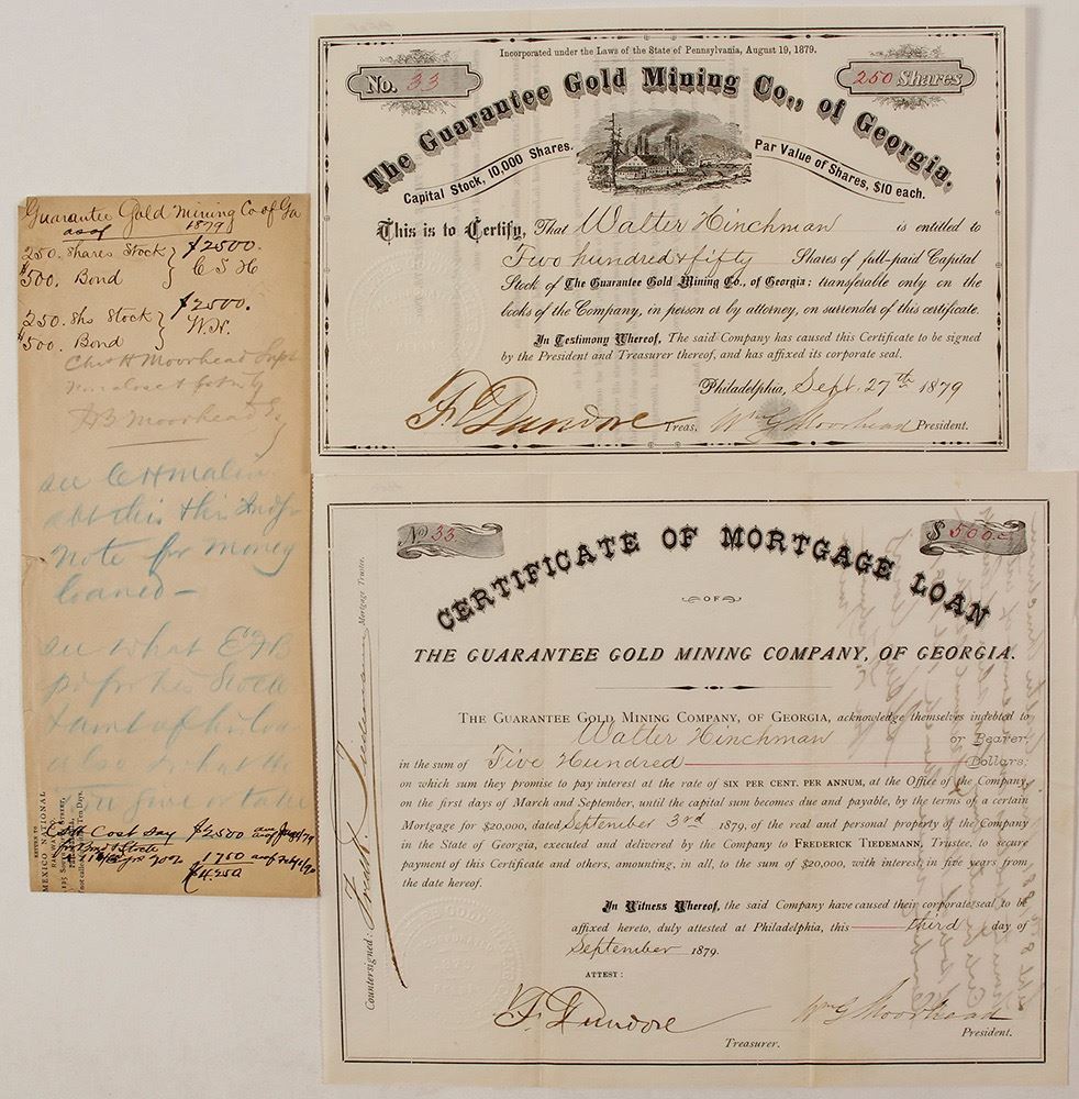 Unique grouping! 1) Stock certificate number 33 to Walter Hinchman for 250 shares on September 27, 1879. Signed by treasurer F Dundore and president William G Moorhead. Vignette of mill with steam train in the background. 5.75 x 9". Nearly perfect, The two vertical folds are heavy, but no paper fiber has been broken. 2) Certificate of Mortgage Loan for Walter Hinchman for $500. Signed by Dundore, Moorhead and trustee Frank Tiedemann. Same condition as the stock. Note on back about buying Walter Hinchman $20 on account on March 1, 1881. 3) Maybe the most interesting piece is this hand written note. "Guarantee Gold Mining Company of Ga. / as of 1879 / 250 shares stock, $2,500 C. S. H. / $500 bond, C. S. H. / 250 shares stock, $2,500 W. H. / $500 bond, W. H." It looks like Walter HInchman and, we assume, C. S. Hinchman have provided all, or at least some, of the monetary support to this time? Note is on Mexico National Railway Company of Philadelphia letterhead (partial!).