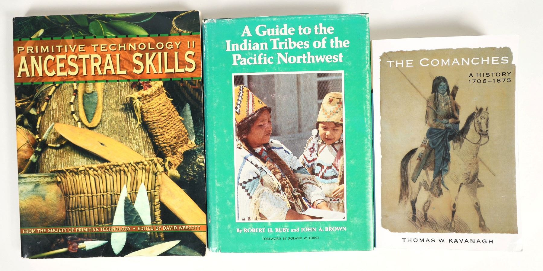 This is a three book grouping exploring the Indian cultures. There is the "Guide to the Indian Tribes of the Pacific Northwest", by Ruby and Brown , 1986, pp.277 hardcover with DJ lightly worn DJ. "Primitive Technology 2 Ancestral Skills" by the Society of Primitive Technology, paperback 2001, pp.248. Some wear foxing on the corners. This volume covers making your own tule boats and firemaking, etc. "The Comanches A History 1706-1875" by Kavanagh, paperback, 1996, pp.515. Very good condition. Important references in the Anthropology library.