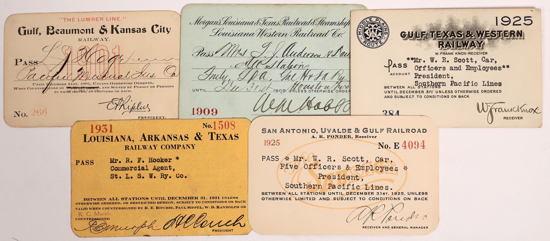 Lot of five railroad passes from the Gulf of Mexico area: 1) 1901 Gulf, Beaumont & Kansas City Railway "The Lumber Line" pass No. 266; 2) 1909 Morgan's Louisans & Texas Railroad & Steamship Co. Louisiana Western Railroad Co. pass No. 1469, issued to Mrs. T. J. Anderson & Daughter; 3) 1925 Gulf, Texas & Western Railway pass No. 384, issued to Mr. W. R. Scott, president, Southern Pacific Lines; 4) 1925 San Antonio, Uvalde & Gulf Railroad pass No. 4094, issued to Mr. W. R. Scott, president Southern Pacific Lines; 5) 1931 Louisiana, Arkansas & Texas Railway Company pass No. 1508, issued to Mr. R. F. Hooker. State: City: Date: Provenance: