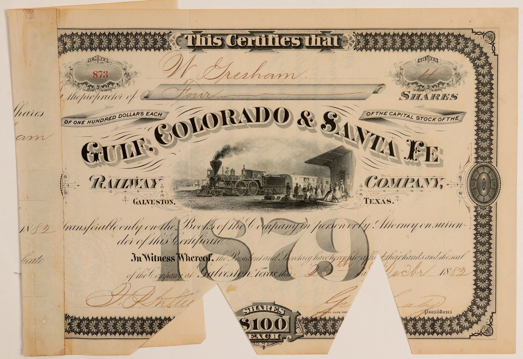 Stock Certificate from the Gulf, Colorado & Santa Fe Railway Co. Incorporated in 1879. Certificate number 873 issued in 1882 at Galveston, Texas. Issued to W. Gresham. Size 10 by 7.125 inches. In average condition. Large cut canceled. Nice vignette of train in the station, with passengers loading and ocean in the background.... Galveston TX . The Gulf, Colorado and Santa Fe Railway was a subsidiary of the Atchison, Topeka & Santa Fe Railway in eastern Texas and to Purcell, Oklahoma.